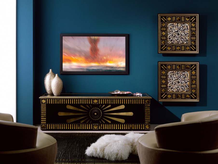Chest Sitting Case of the Italian manufacturer Vismara. The chest of drawers of rectangular shape made of wood. Color in the black version with gold patterns.