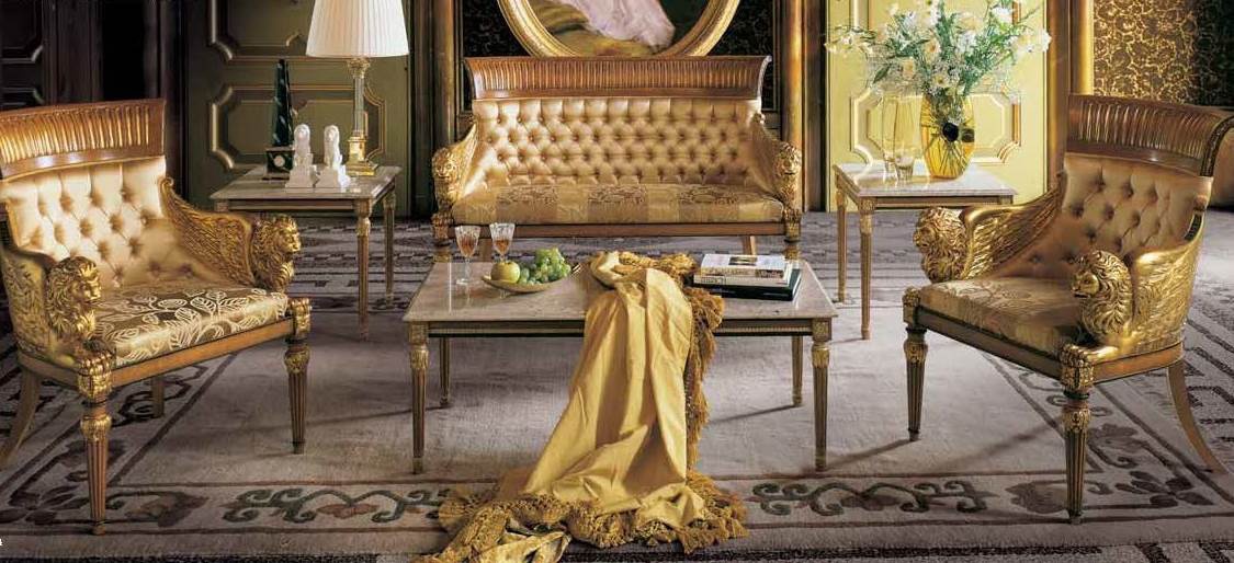 Sofa set from the Italian manufacturer Ezio Bellotti. The frame and legs are made from a natural tree, decorated with handmade carving. Finish - lacquer, gilding. The design is complemented by decorative stitch Capito. Upholstery textiles, colors in stock.