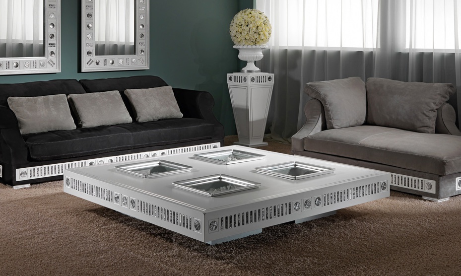 Coffee table 4 Windows Italian manufacturer Vismara. White color table. Equipped with four glass shelves. Silver table decorated with geometric patterns. Perfectly complement modern interior living room.