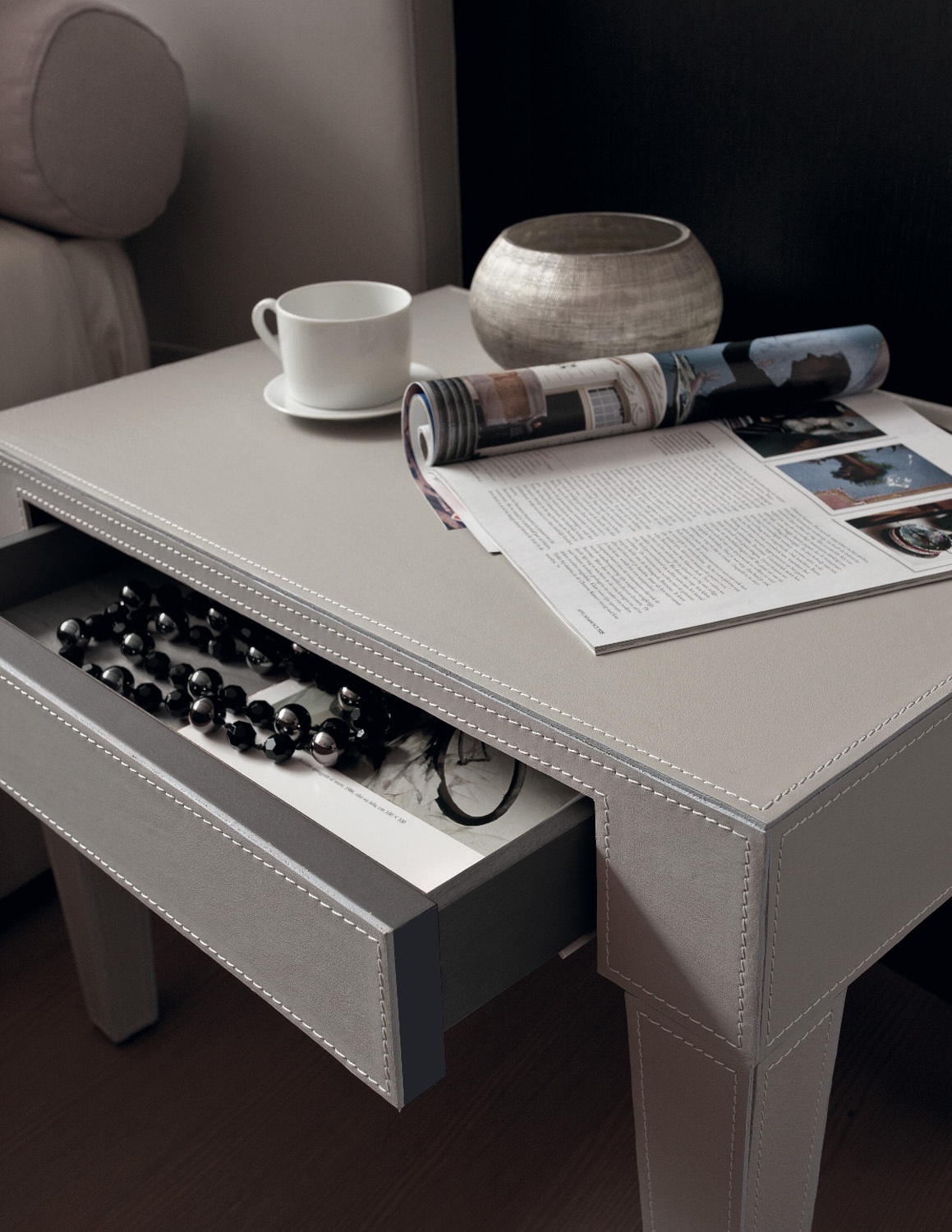 Bedside table dark wood from the Italian manufacturer Porada. Model with drawer with surface finish. Available in leather, mirror, gold, silver. The table is designed in modern style.