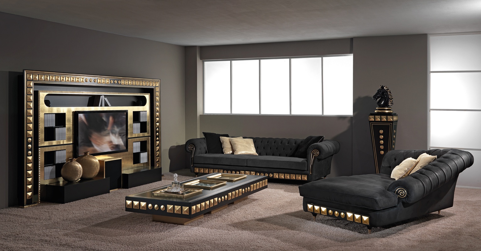 Furniture for home theater Home Cinema The Wall Italian manufacturer Vismara. Presents a model of furniture designed for TV. Color in black with gold accents. Equipped with the necessary shelves and drawers to install cinema.