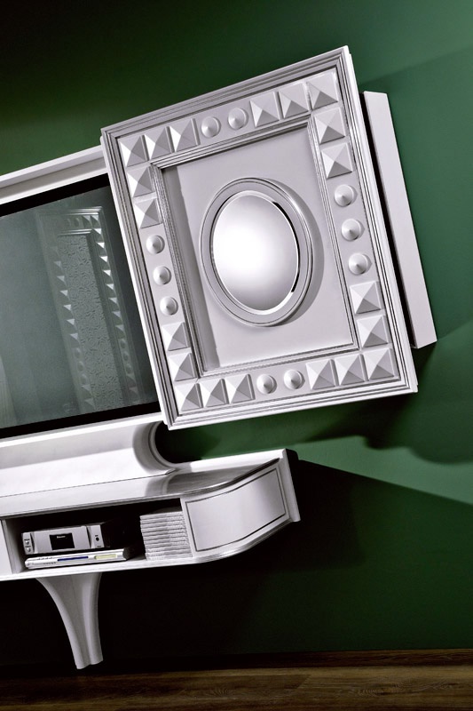Furniture for home theater Home Cinema Sliding Italian manufacturer Vismara. Panel with sliding doors, in white. Equipped with shelves and drawers to install a home theater. Design solution for modern living.