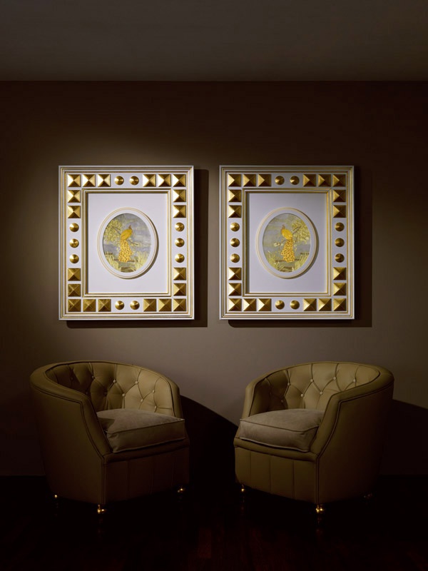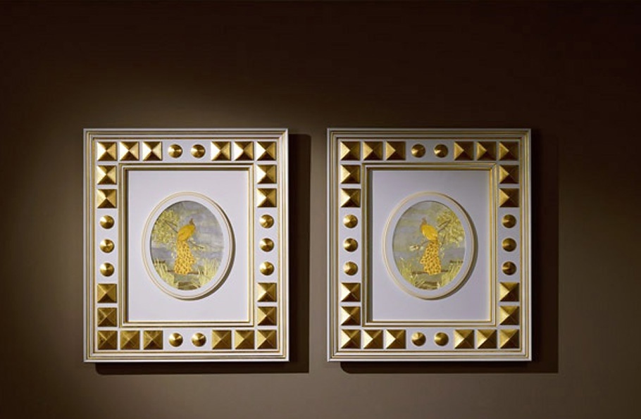 The picture Pavone Italian manufacturer Vismara. Picture in a frame with geometric decorative elements, depicting a peacock. Color scheme in white with gold. Perfectly complement modern interior of a hall or living room.