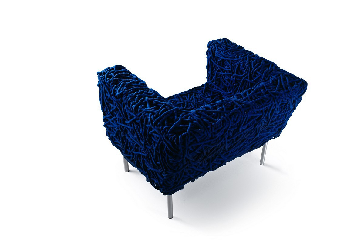 A chair with arms Azul from the Italian manufacturer Edra. The model is made from woven ropes. Each seat requires approximately 650 metres of special cotton ropes. The chair is handmade. A skillful sequence is irregular weave of special rope with an acrylic shell. The metal frame is coated with epoxy powder. Modern design work.
