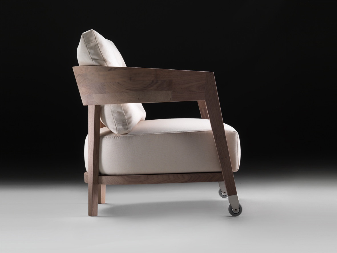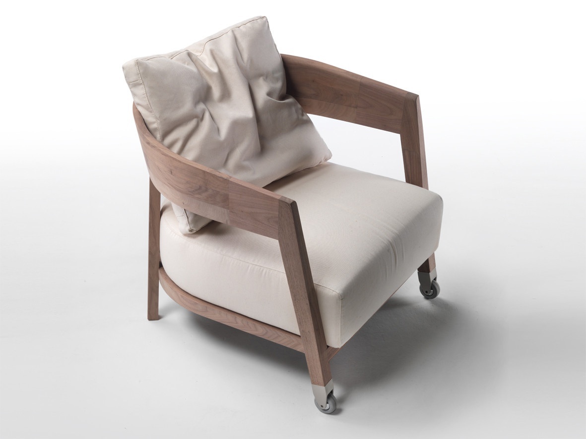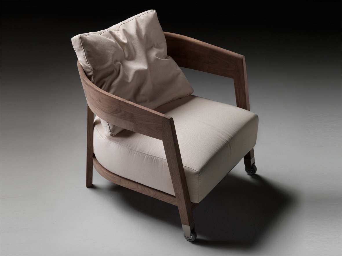The Caroline chair from the Italian manufacturer Flexform. The model with the semi-circular back which fades into the armrests. The back frame and backrest made of solid wood, polyurethane foam filling, the front legs have wheels. Back cushion made of goose down, upholstery - removable fabric or leather covers, colors to choose from a range of companies.