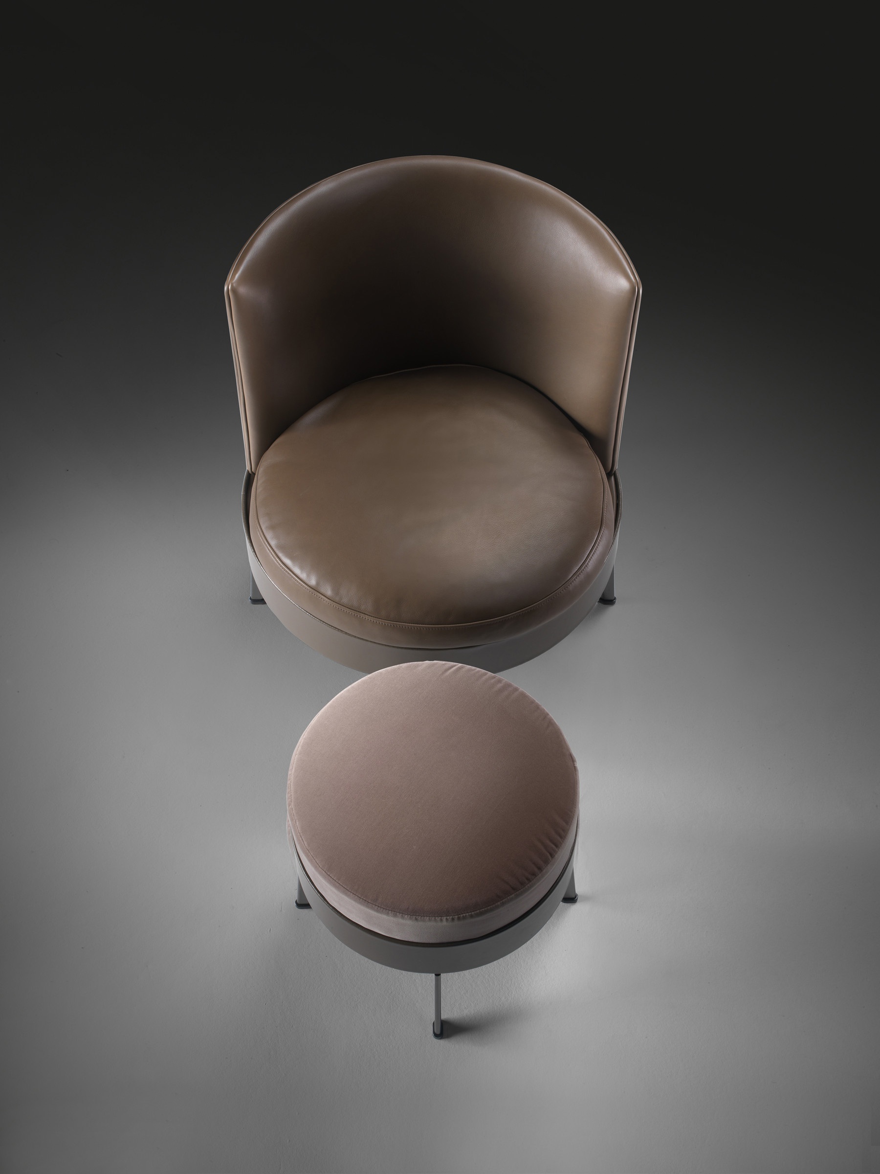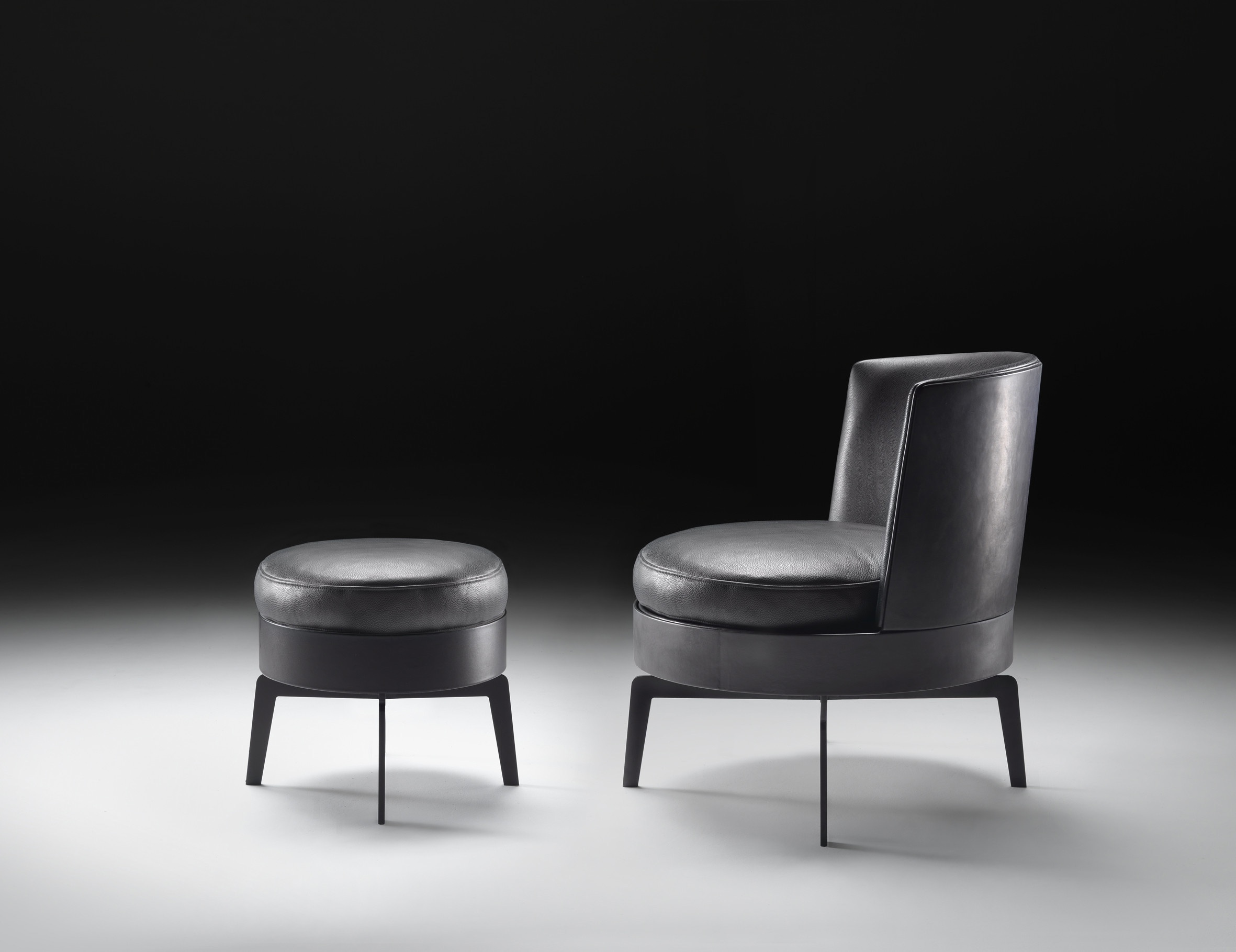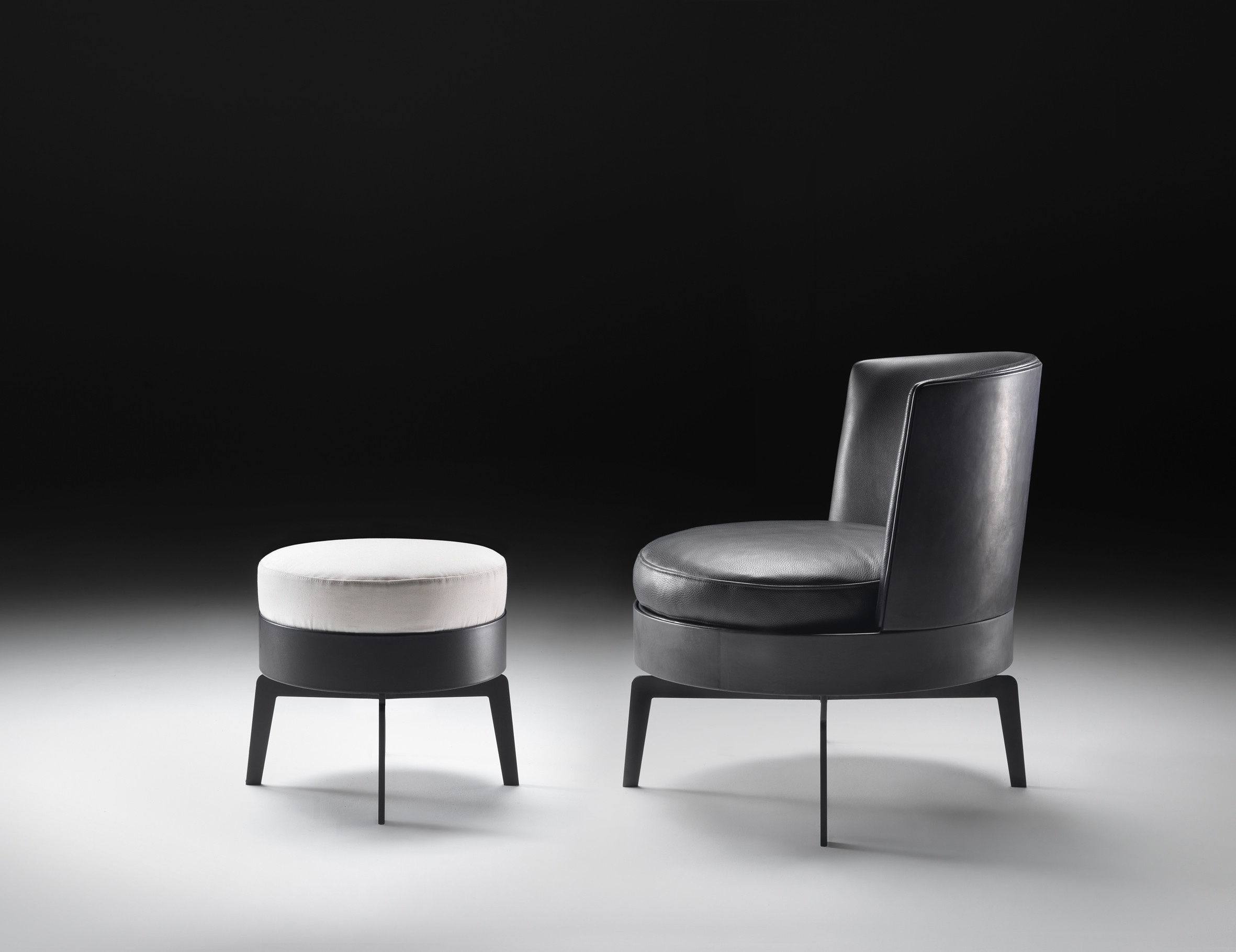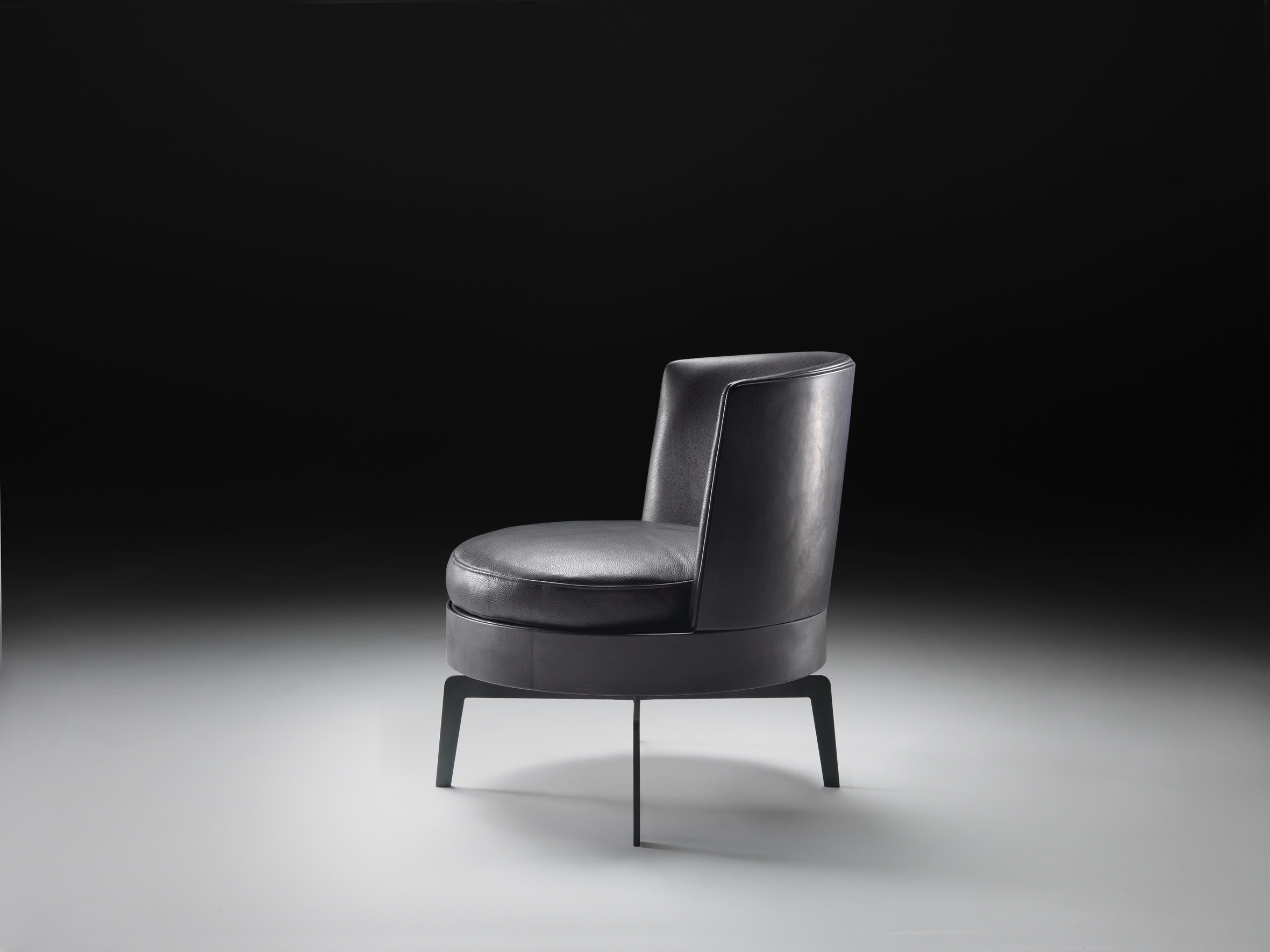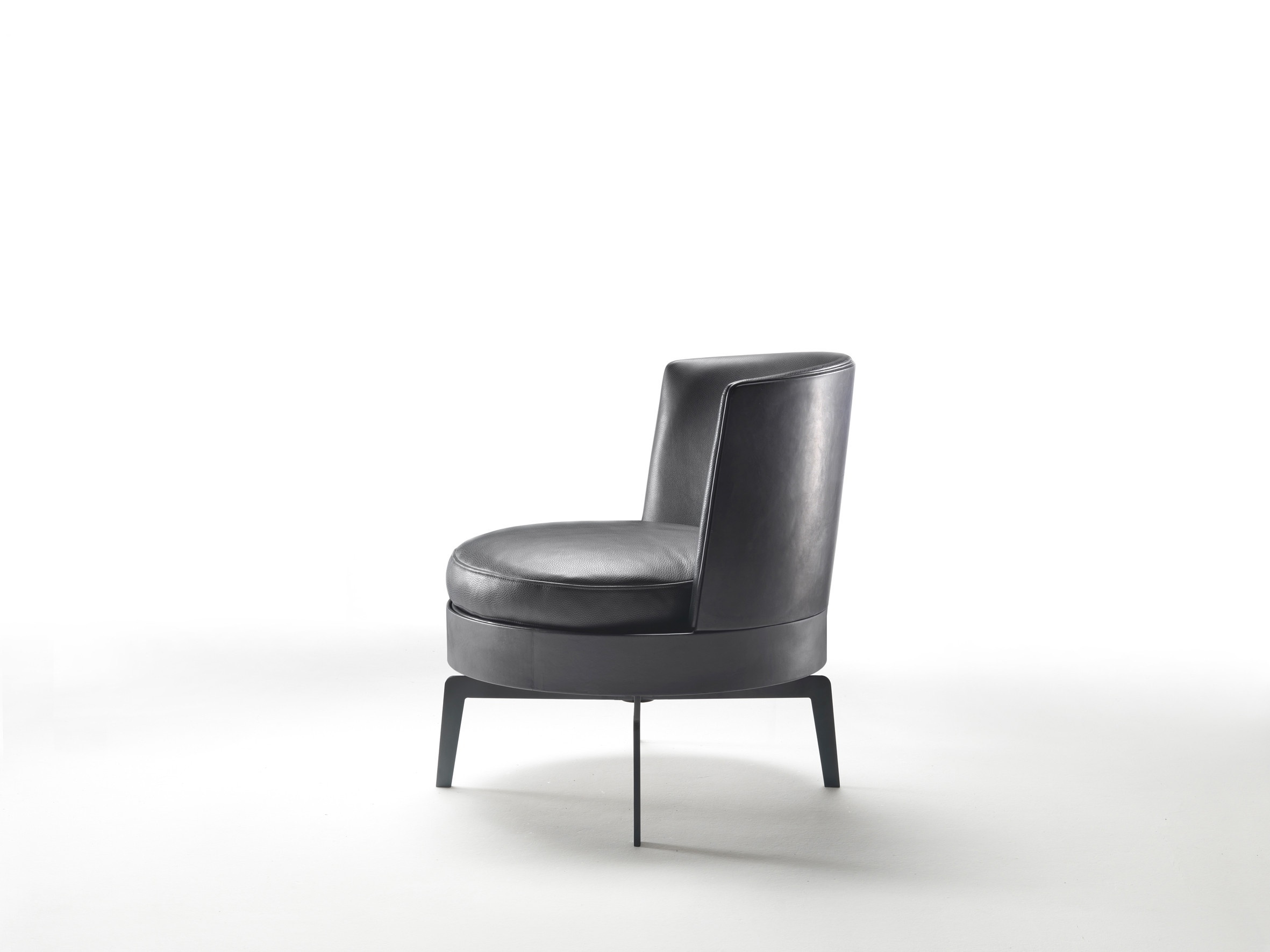 The Feel Good armchair from Italian manufacturer Flexform. The model with upholstered seat round shape, on a frame of solid wood or metal, the filling of rigid polyurethane. Seat padding made of feather, upholstered in leather or textile to choose from a catalog company. The model can have a rotation mechanism, and additionally, the factory offers a poof. The model is in modern style.