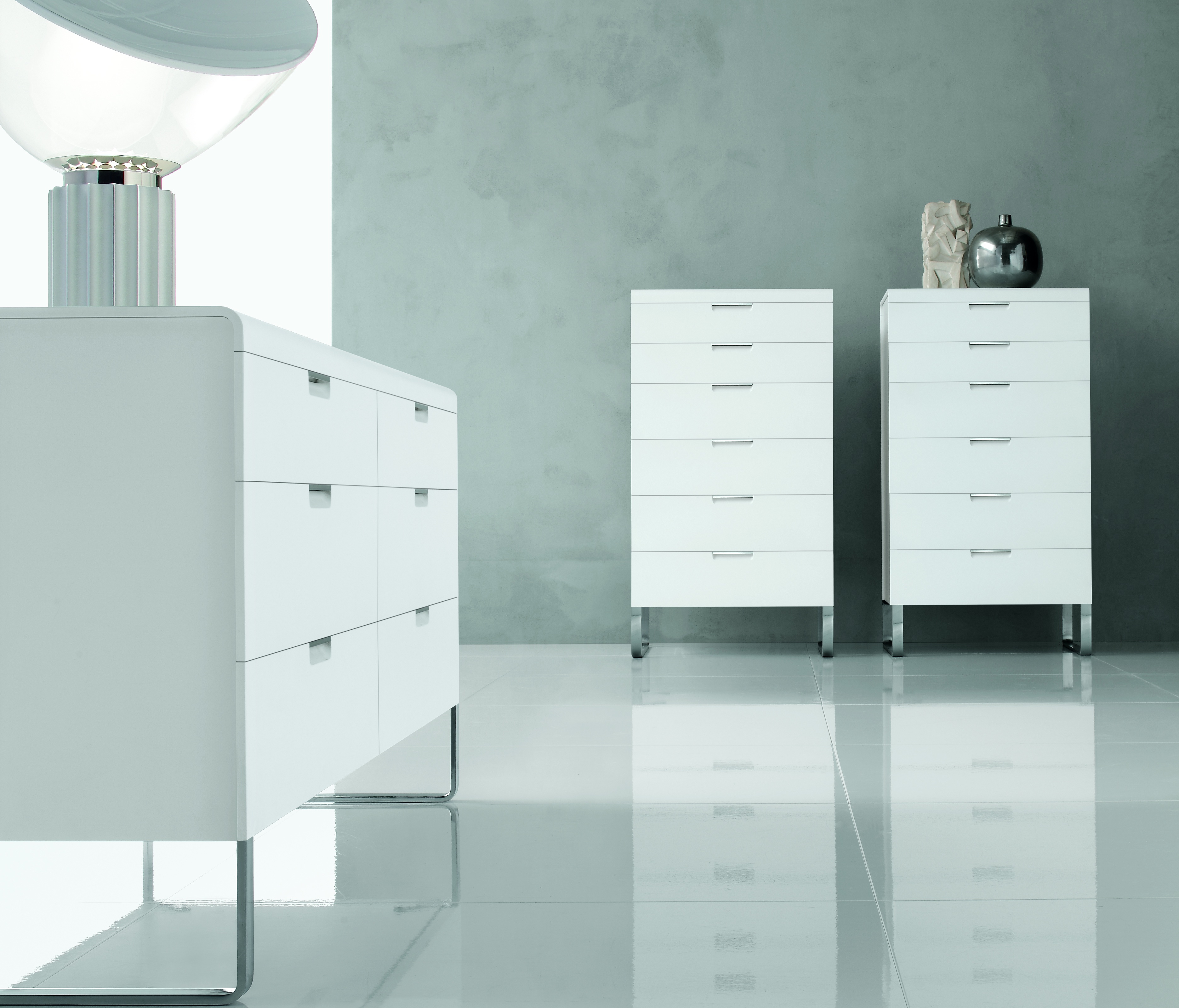 The Esprit chest of drawers from Italian manufacturer Alivar. Modern design furniture. Chest of drawers or Matt lacquered MDF. Base chromed or lacquered steel. Colours in stock.