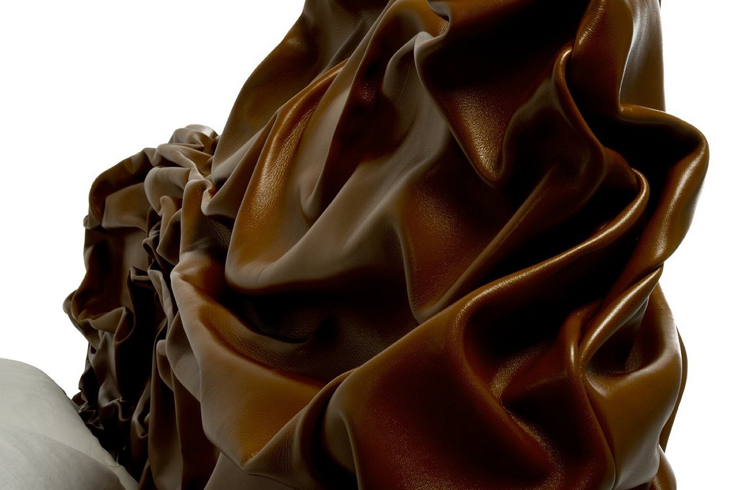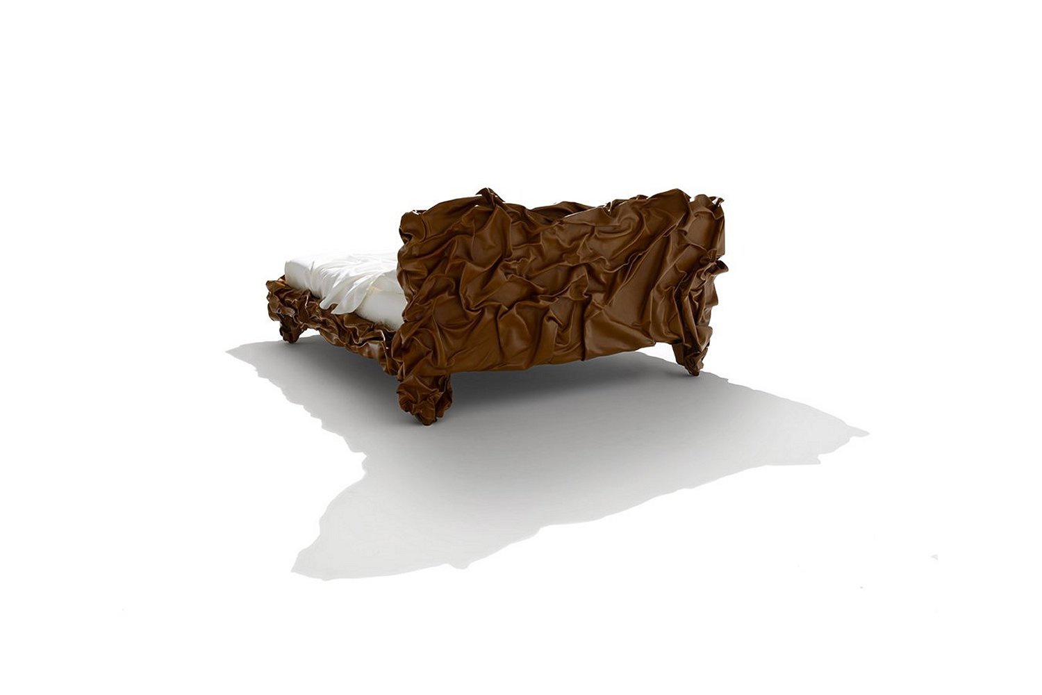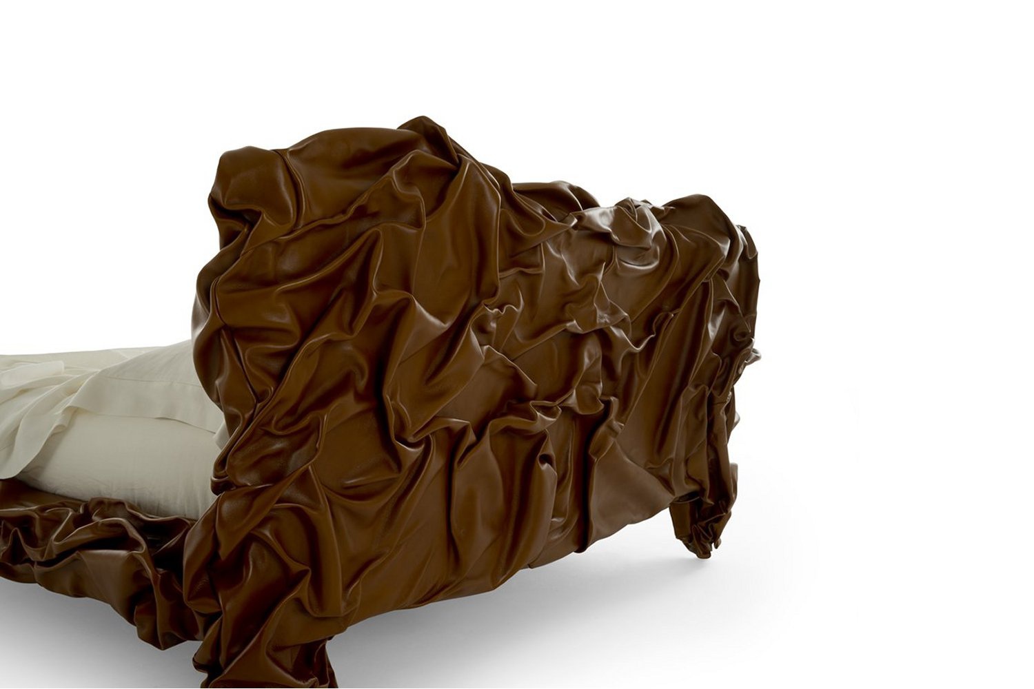 Double bed on steel frame Grinza bed from Italian manufacturer Edra. Upholstered bed with headboard, handcrafted in leather upholstery. Filler - polyurethane. The metallic structure. Slatted bed base made from plywood with coating. Model of modern design. Colors from the company portfolio.