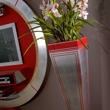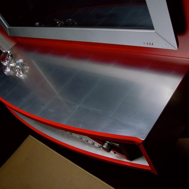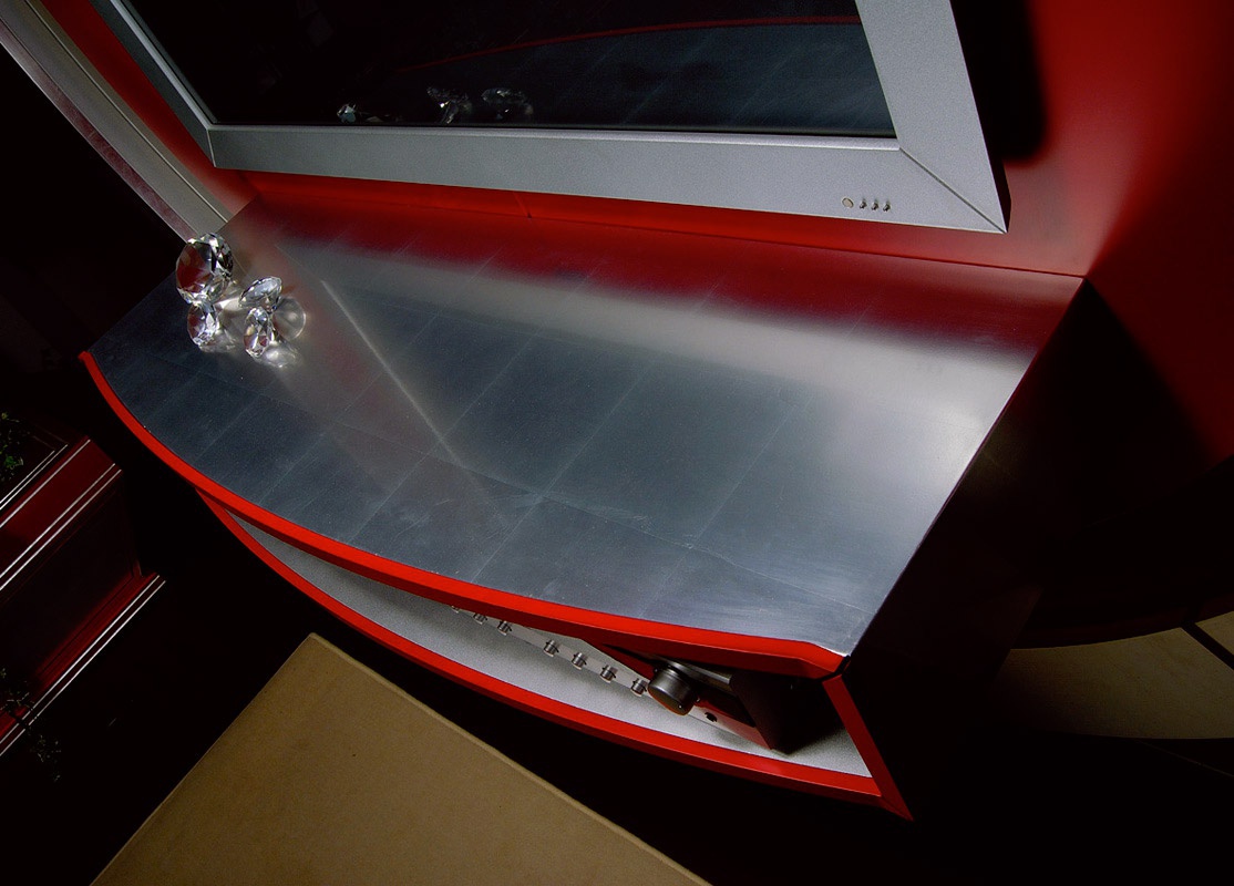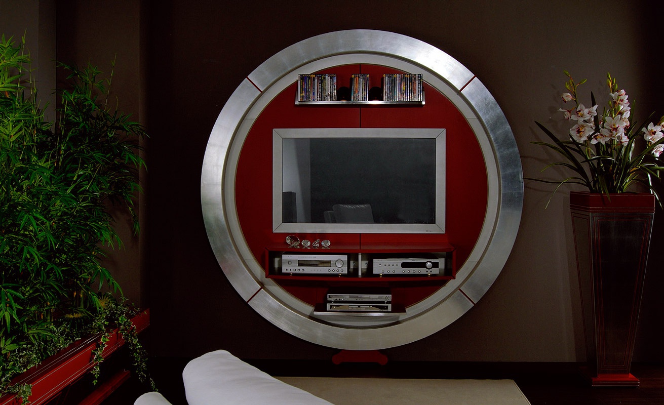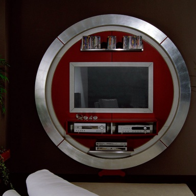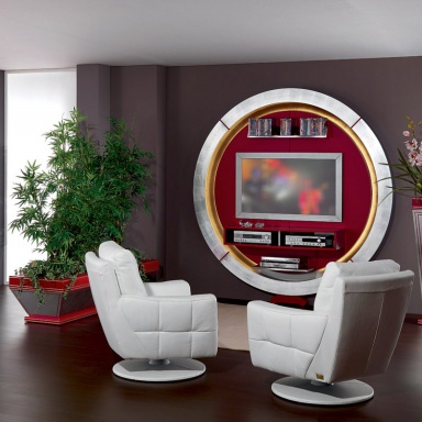 Furniture for home theater Star Gate Italian manufacturer Vismara. The round shapes of the furniture, with built-in shelves. Color in silver and red. Design solution for modern living.
