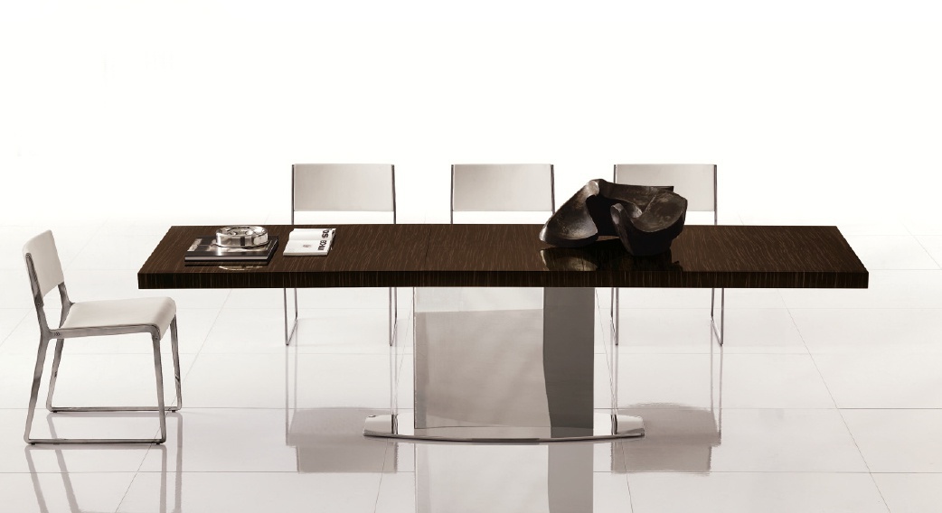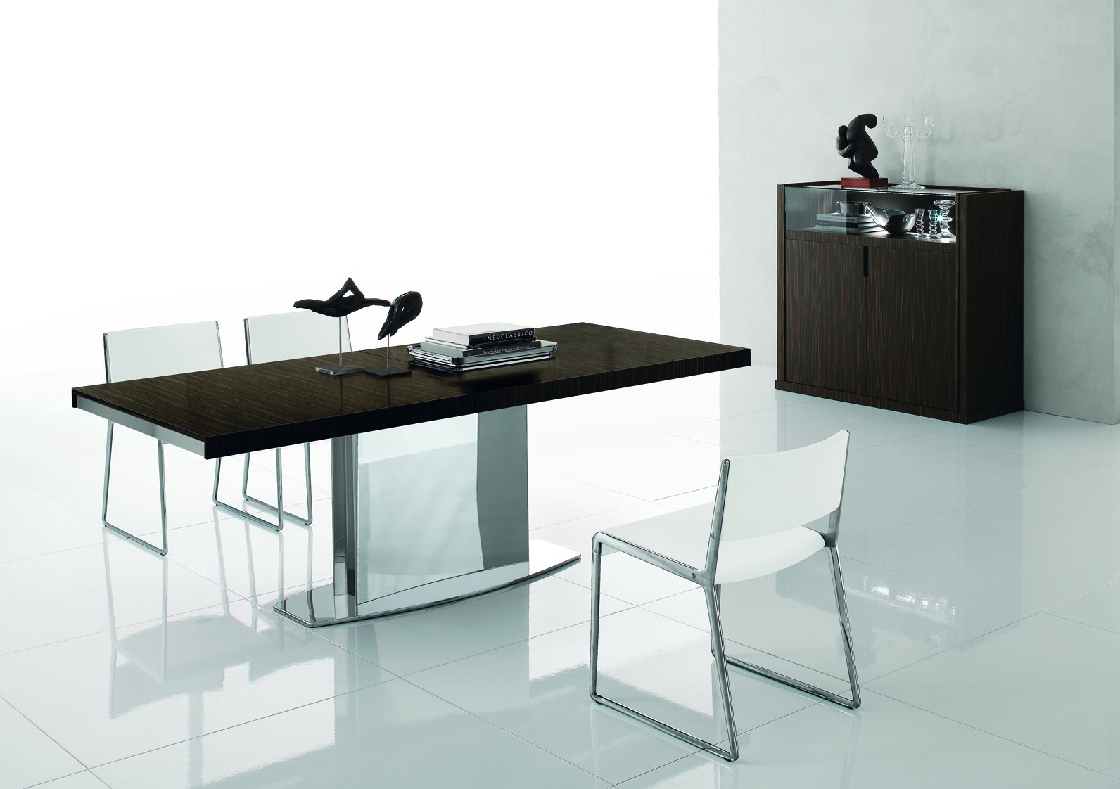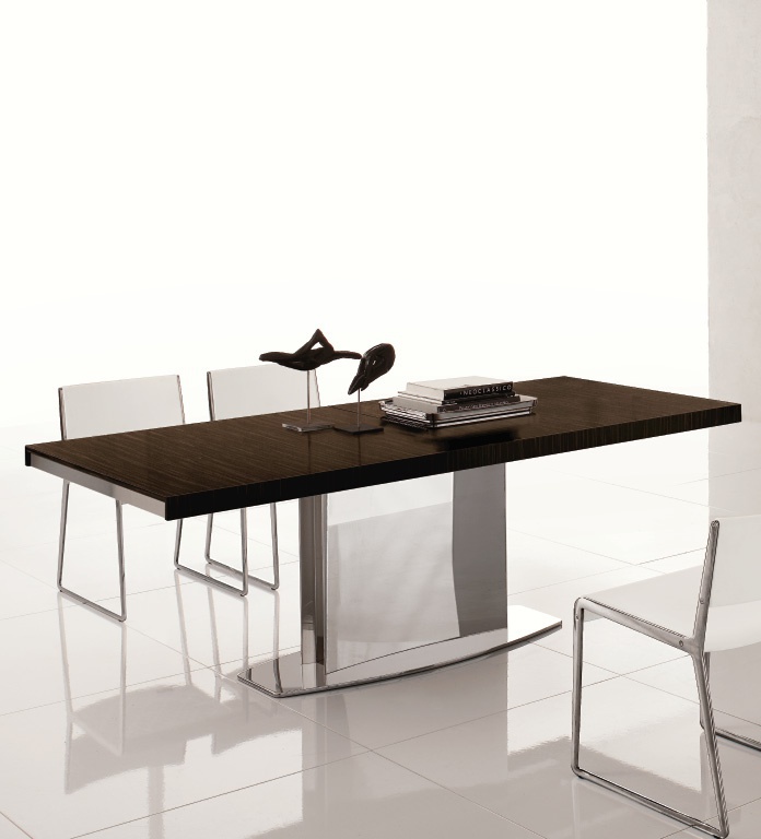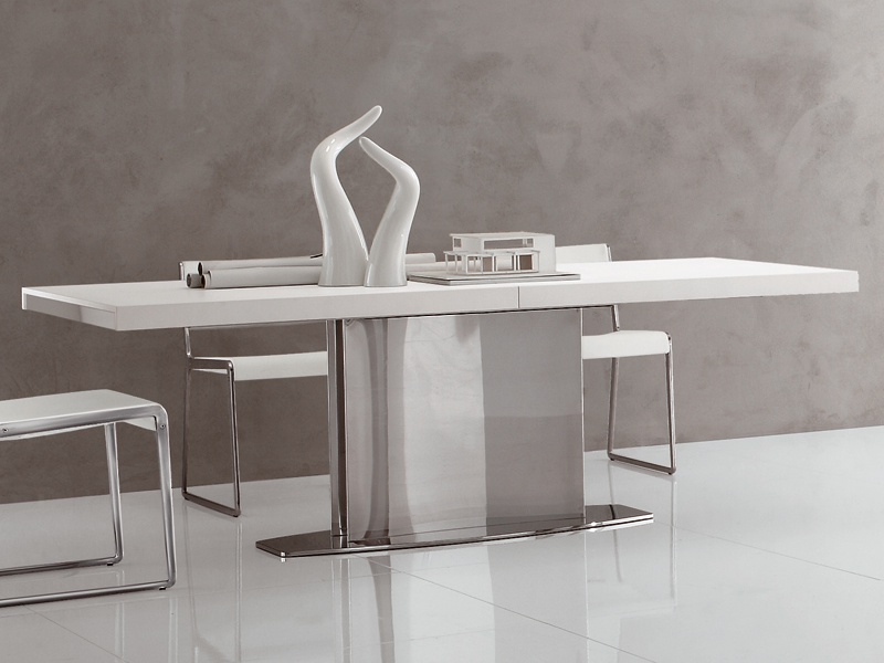 Sliding table Loto from the Italian manufacturer Alivar. Modern design model. Rectangular extension table, the base of mirror-polished stainless steel. Sliding the table-top version is available in oak or in lacquered MDF. Colours in stock.