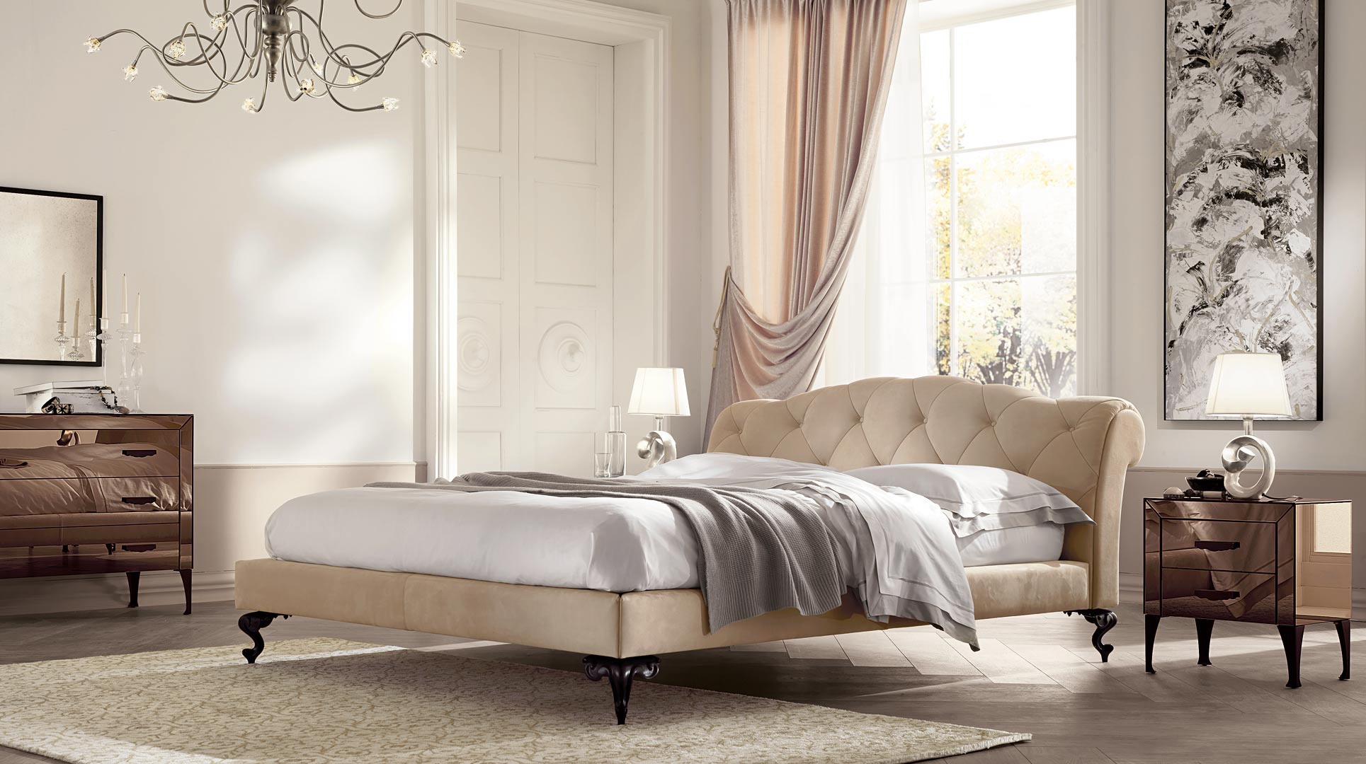 Double bed with upholstered headboard George basso from the Italian manufacturer Cantori. Model of the collection of Chic Atmosphere designed in the art Deco style. Bed frame with legs handcrafted from cast aluminum. Bed with upholstered headboard with filler - polyurethane foam. Upholstery - textiles, leather or nubuck. The decor is a stitch Capito.