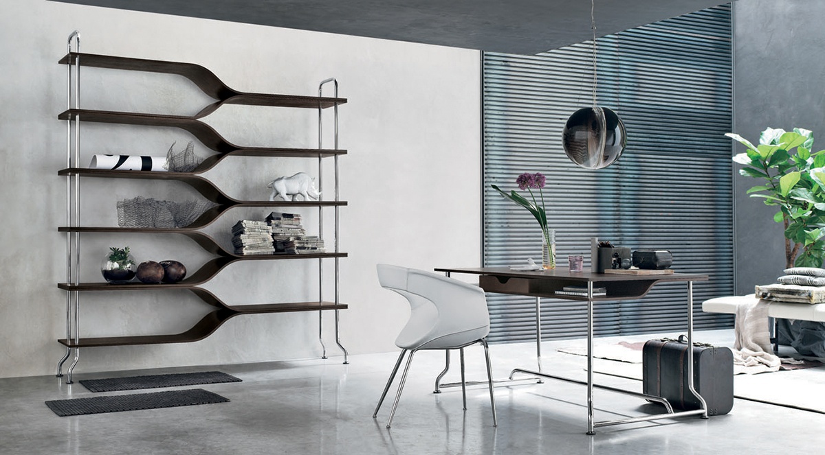 The Diapason bookcase from the Italian manufacturer Alivar. The frame is made of steel, tubular chrome-plated frame. Shelf in painted oak. Perfect choice for modern interiors. Colours in stock.