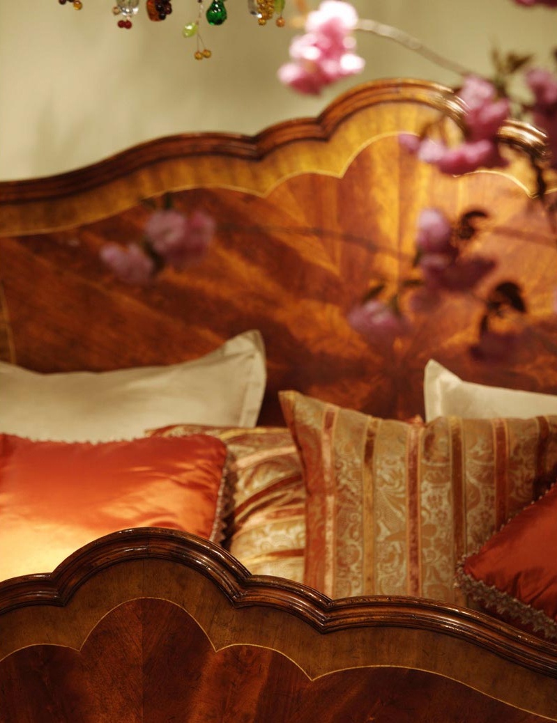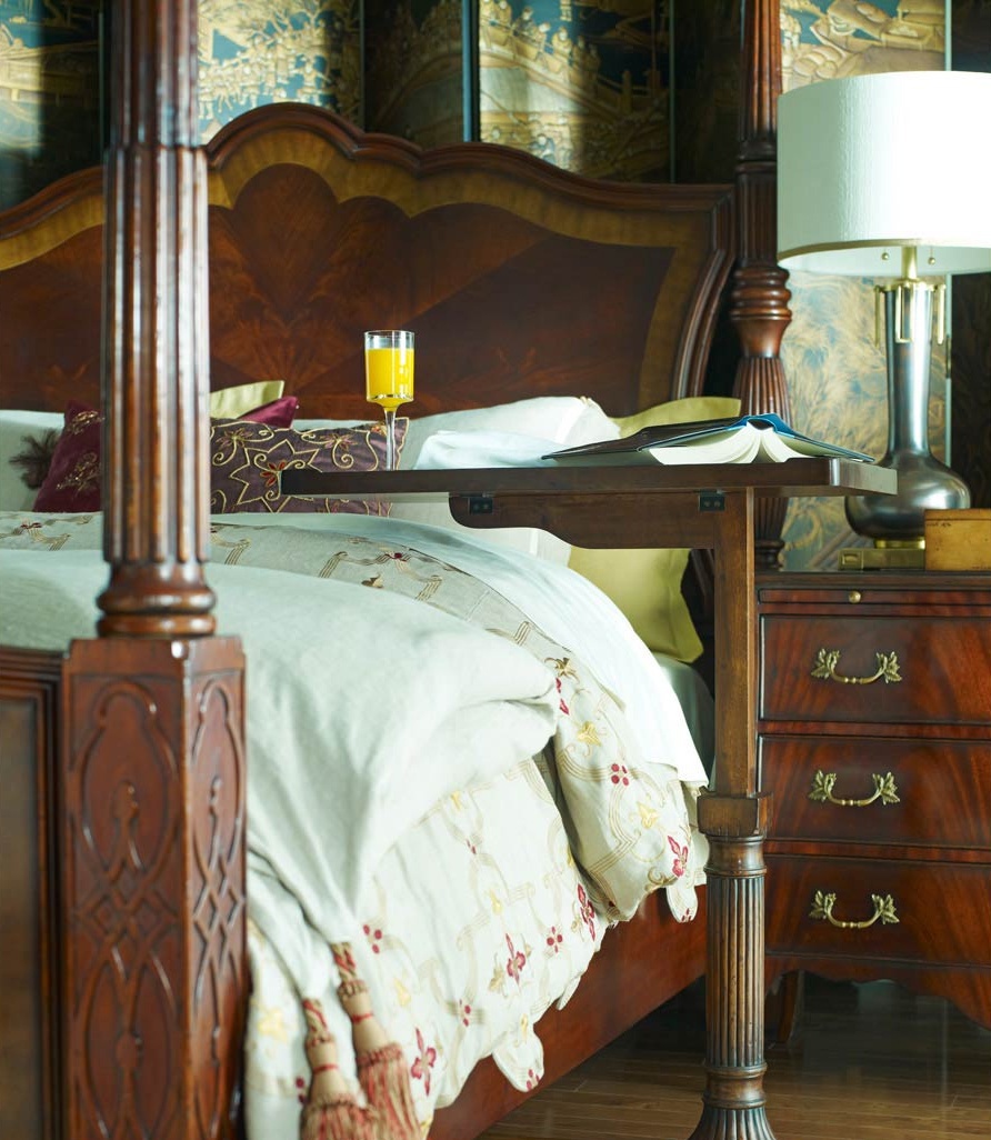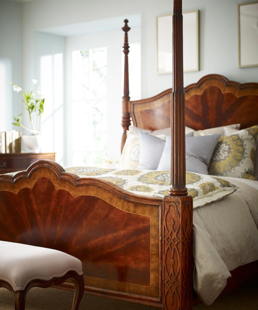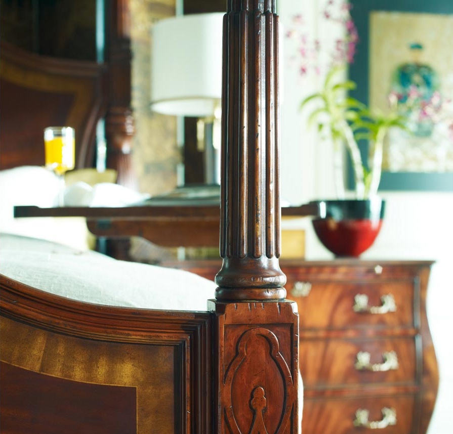 The bed is UK King/American Queen from UK manufacturer Jonathan Charles. The manufacturer offers a double UK King and compact double - Queen UK. Double bed in the style of Chippendale. The frame is made from solid wood and finished with veneer. The model is offered with four figural columns to secure the canopy. The product is decorated with handmade carving and varnished.