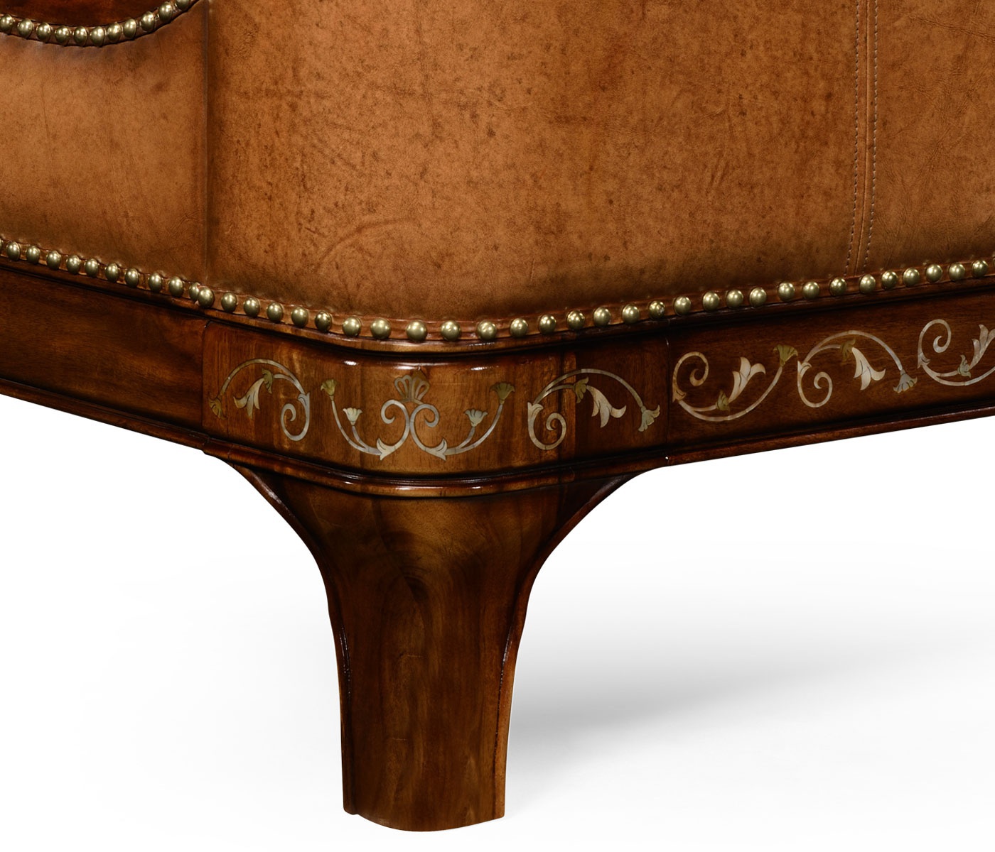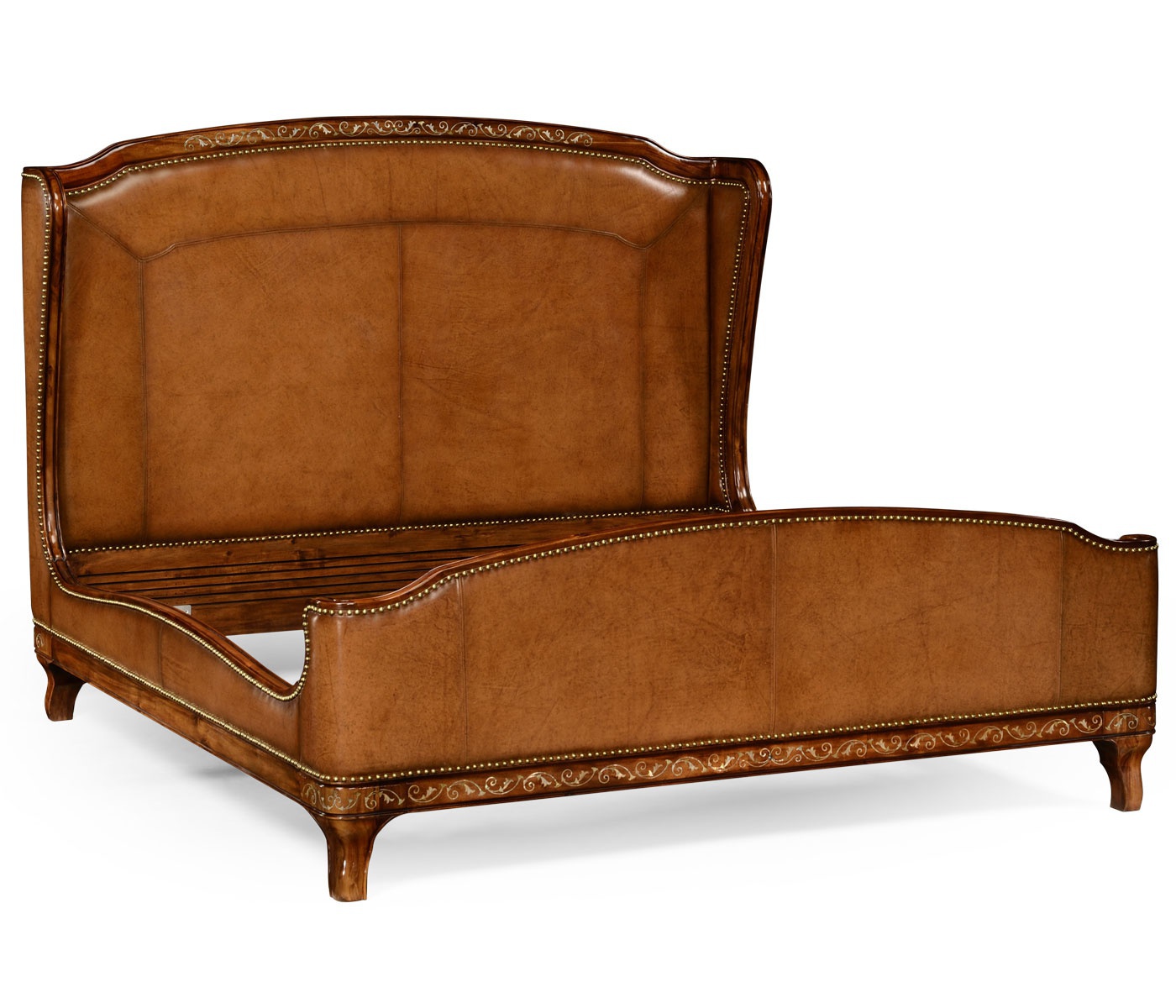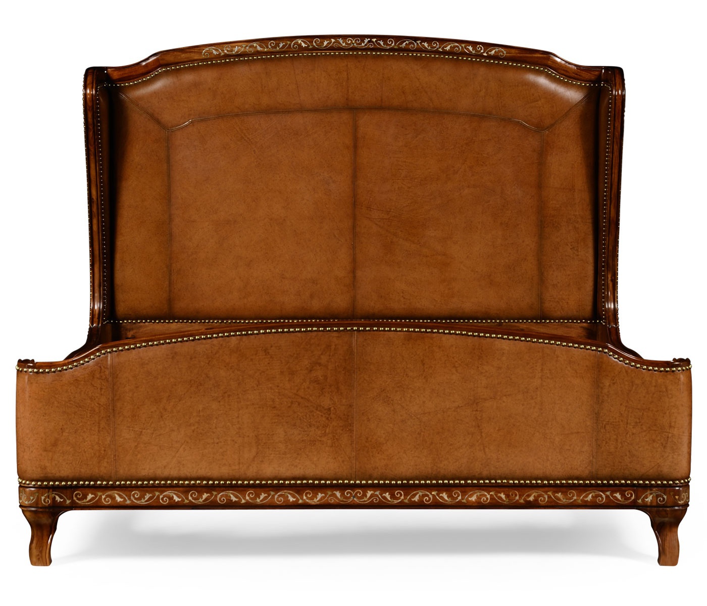 The Duchess bed from the American manufacturer Jonathan Charles. Large double bed made on a frame of wood, with leather upholstery. Model with high winged headboard and footboard. The product in the French style for small feet decorated with carved frame and pearls.