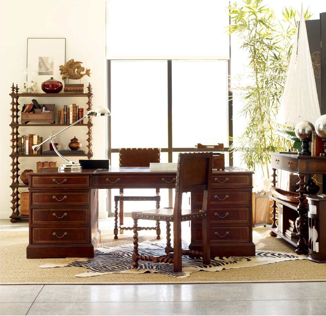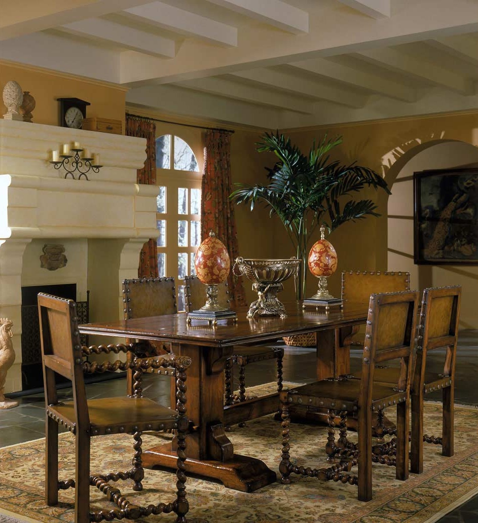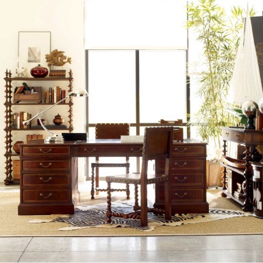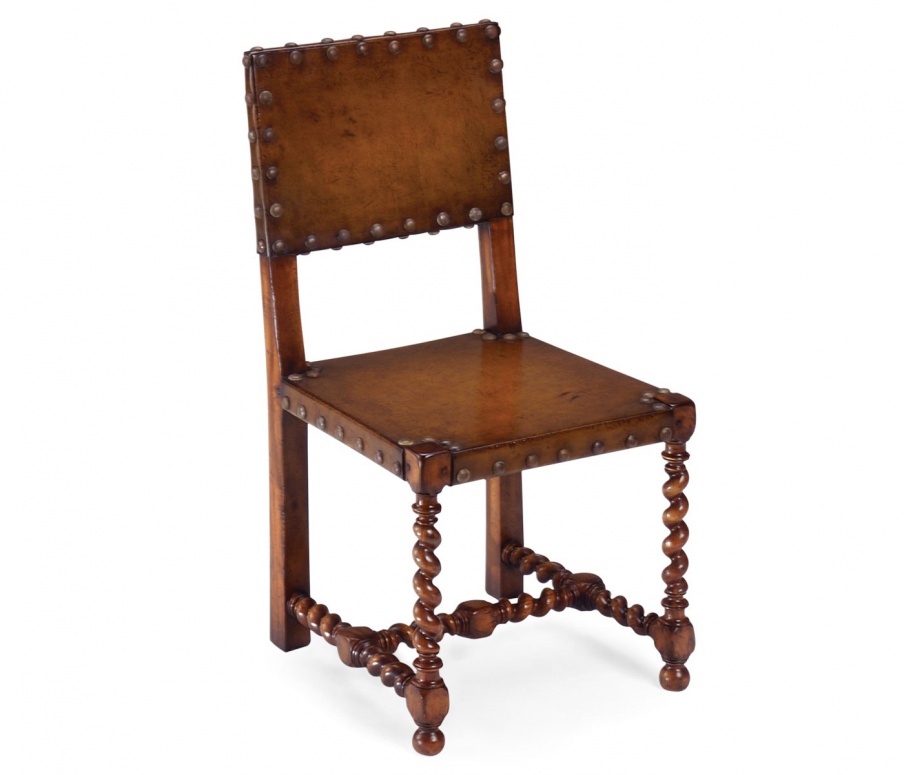 Chair Tudor from the American manufacturer Jonathan Charles. The model without armrests is designed for the living room or dining room. Front legs and support braces in the form of a twisted rod. The chair is made on a frame of walnut wood. Back and seat are covered with skin. The design is antique.