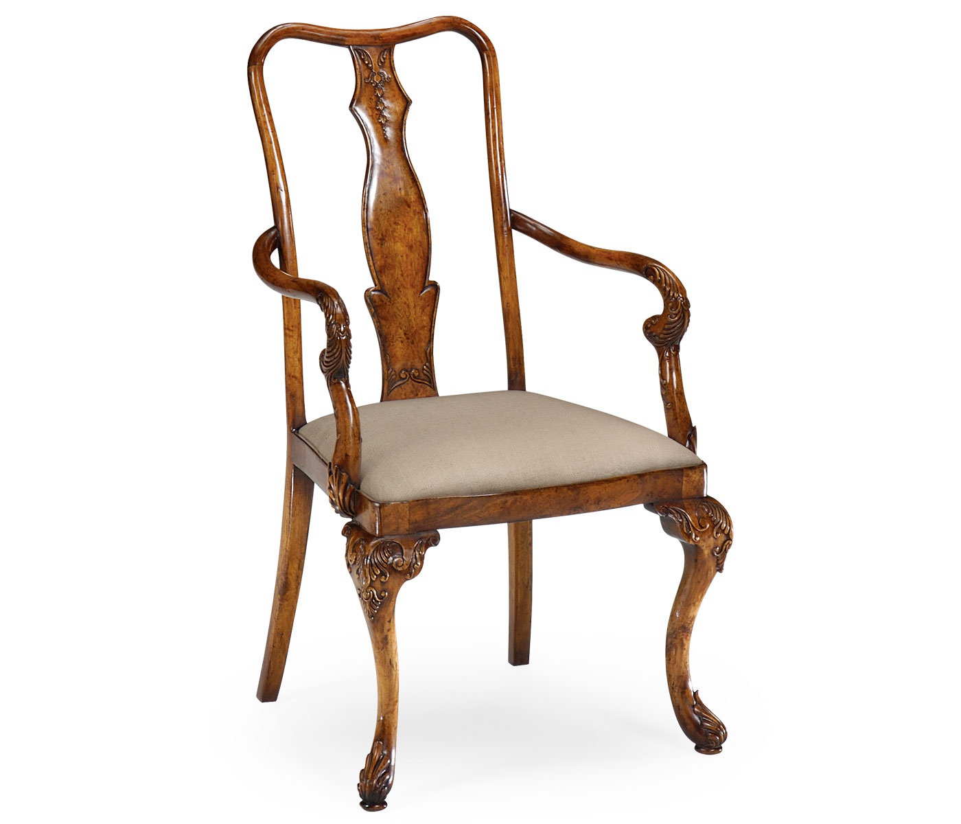 The Queen Anne chair from the American manufacturer Jonathan Charles. The model with high, gracefully curved back and armrests. Front legs and armrests original shape with fine floral carvings. The chair is made on a frame of walnut wood. Seat soft upholstered textiles. The design is executed in classical style.