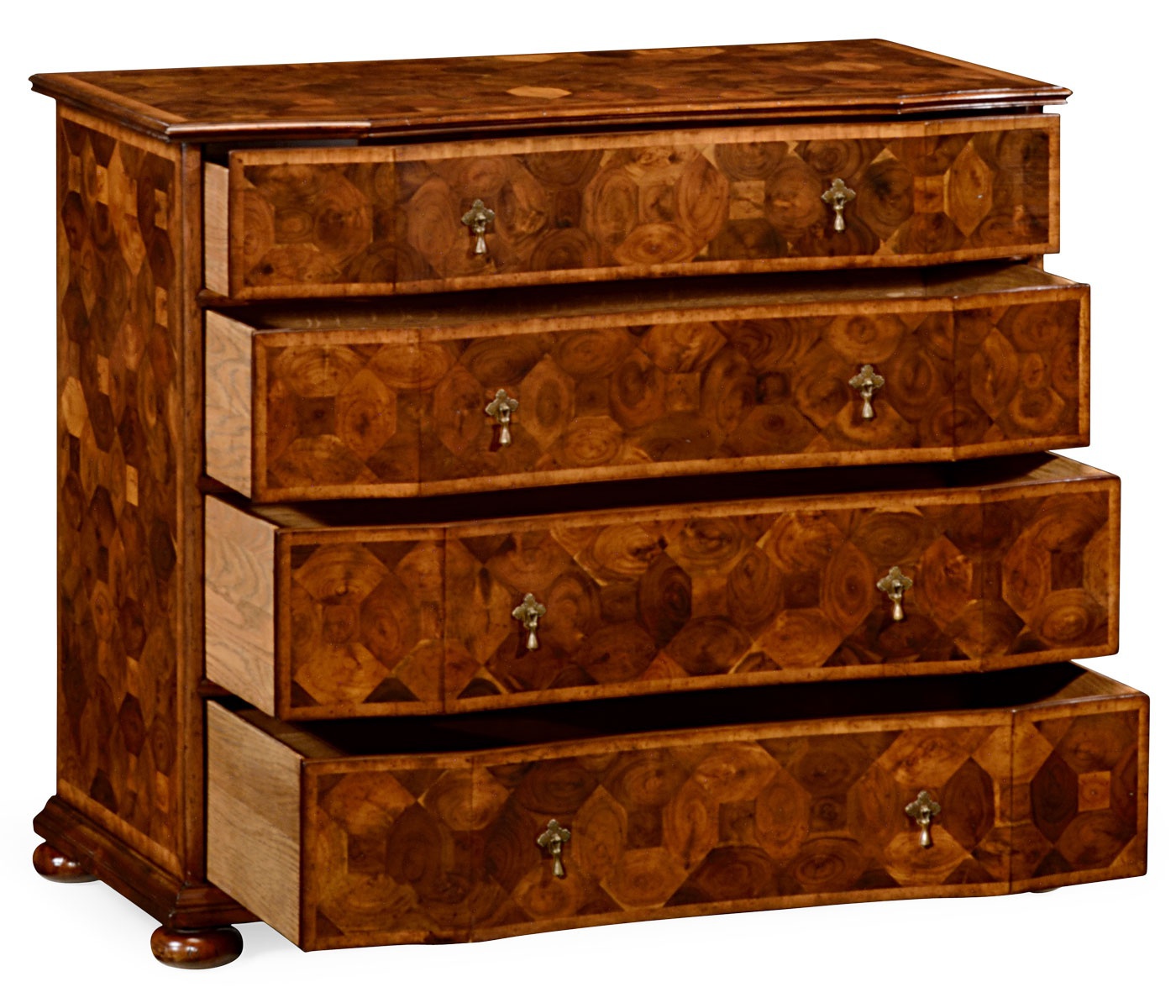 The chest of drawers Country Farmhouse from the American manufacturer Jonathan Charles. Large and practical drawers made of wood. The case is veneered appliances "oyster" - a pattern of small wooden rings creates the visual effect of oysters. The model with four large drawers. Legs wooden round.