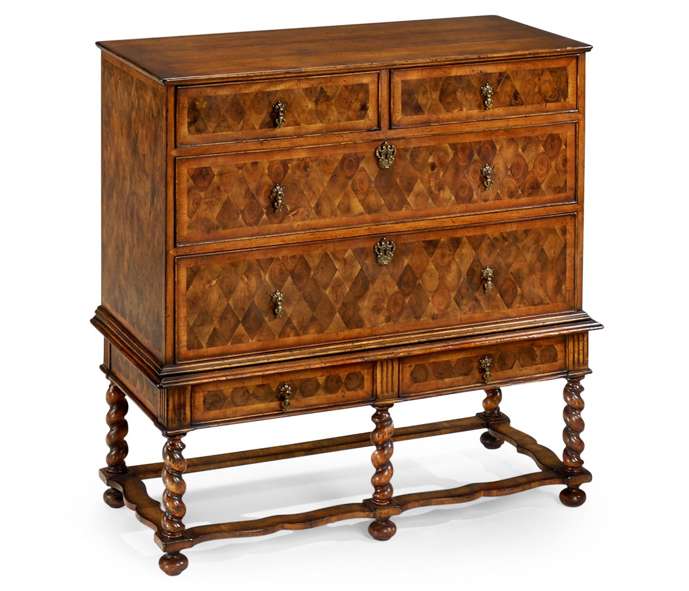 The Windsor chest from the American manufacturer Jonathan Charles. The body is made of veneered wood and the technique of "oyster" - a pattern of small wooden rings creates the visual effect of oysters. The model with two large and four small drawers. Fittings of brass. The anchors are the columns in the form of a twisted rod.