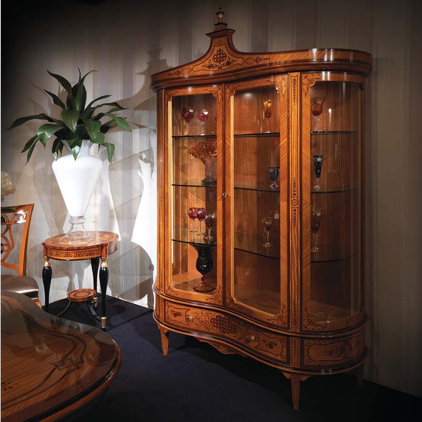 Showcase from Italian manufacturer Ezio Bellotti. The material is solid wood. The model is hand-decorated with carving and intarsia. The surface is covered with varnish. The model is designed for the dining room in a classic style. Colours in stock.