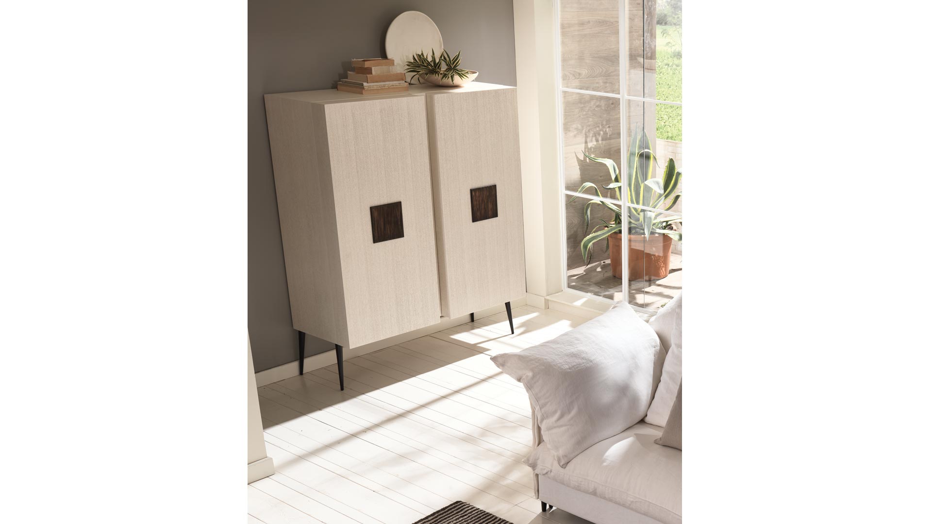 Cupboard City piedi bassi Cabinet with hinged doors from Italian manufacturer Cantori. The model is made in modern style. The body is made of multilayer wood with a preserved structure. Shelves - glass. Finish - patina in contrasting colours, with eight-layer finish. Tapered legs brass cold working, laser cut and electroplated finishes. Colors range from the manufacturer.