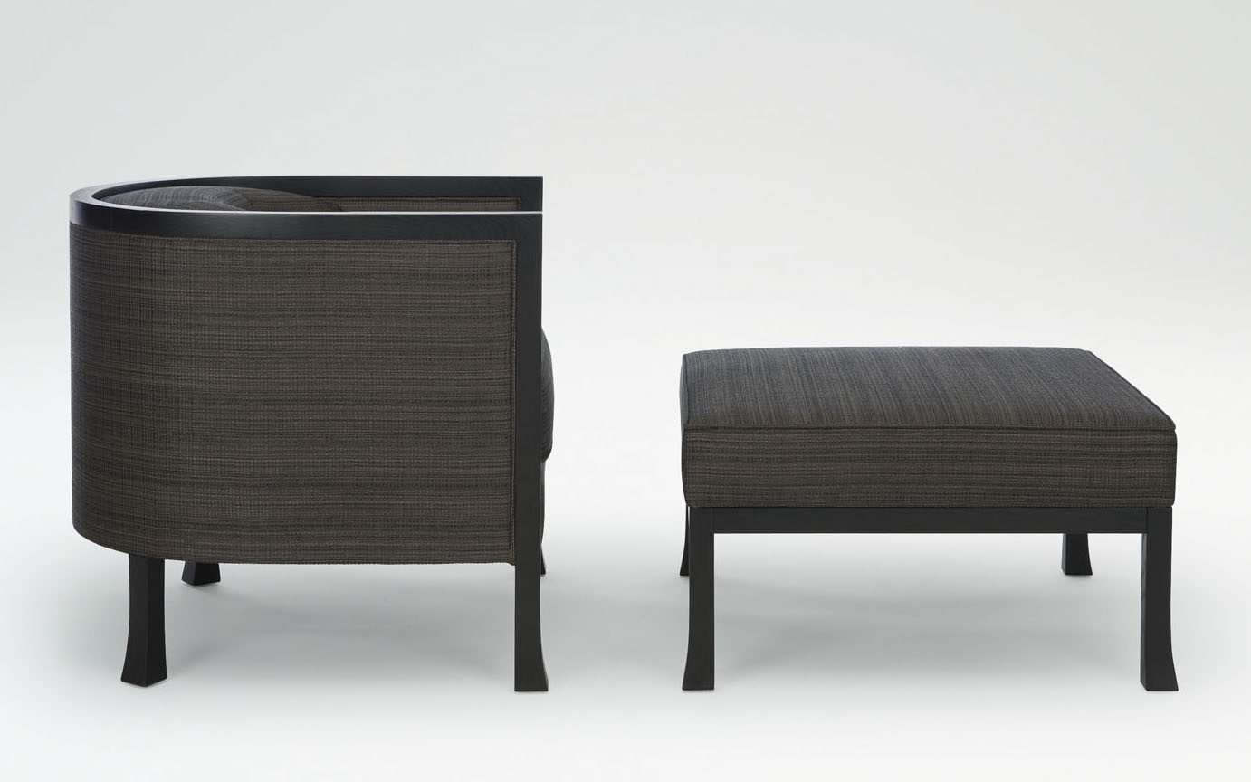 Chair with Ottoman on high legs Talete Italian manufacturer Armani Casa. A chair with a semicircular back which fades into the armrests. Frame chair and stool natural wood. Pouf square shape. The upholstery is made of dark textiles. A modern solution for the living room.