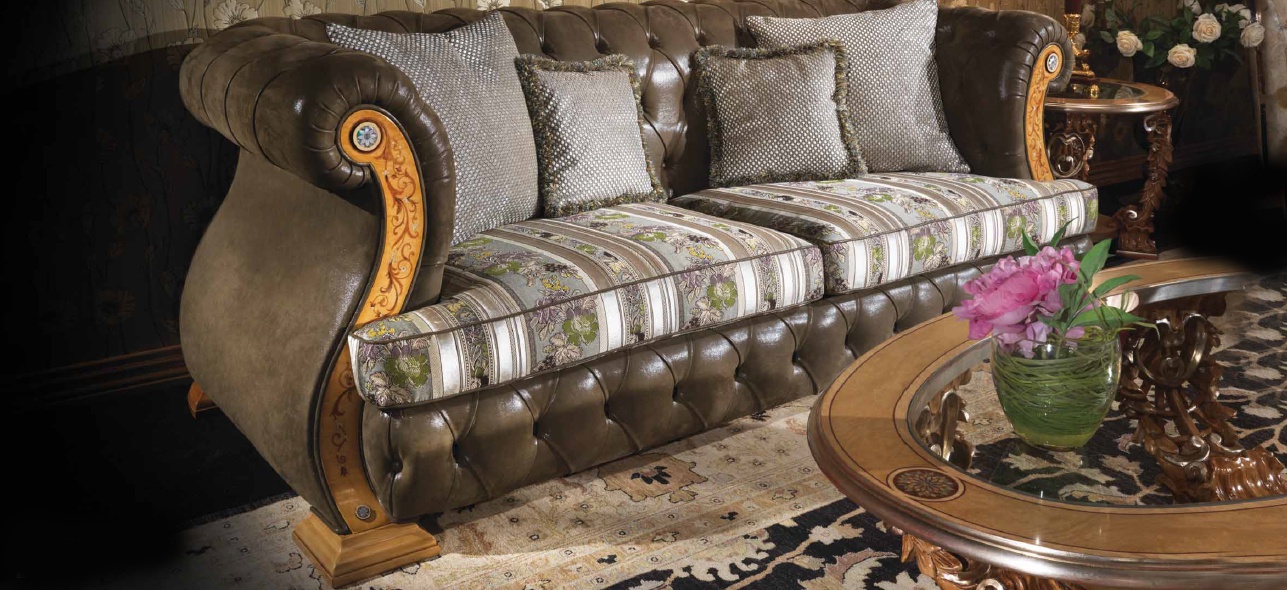 Three seater sofa from Italian manufacturer Ezio Bellotti. The frame is made from solid wood, finishing lacquer. Upholstery - textiles and genuine leather from the company portfolio. The model is supplemented with decorative pillows. Legs are decorated with carvings. Color of the product in the catalog of manufacturer..