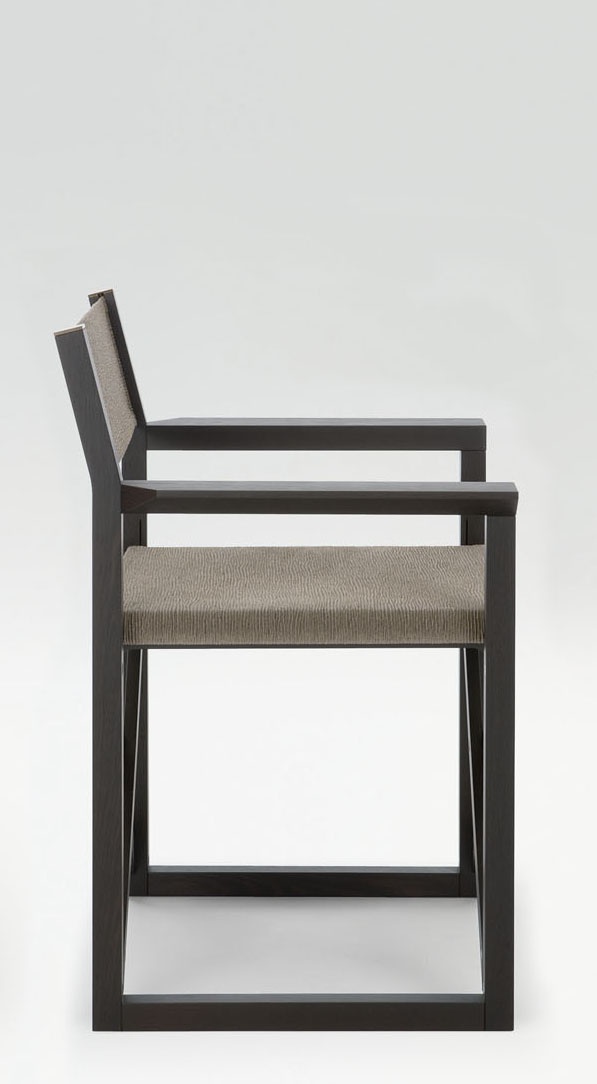 Chair with hard armrests Oscar Italian manufacturer Armani Casa. Model on wooden frame. Backrest and seat made of dense fabric, covered. Color scheme in shades of brown. The modern style of execution.