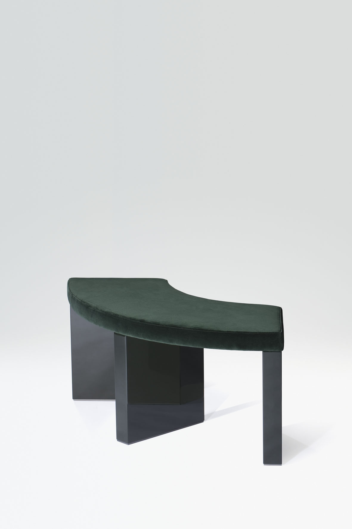 Poof semicircular shape Colette Italian manufacturer Armani Casa. Pouf with wooden frame with upholstered seat. The seat is upholstered in textiles. Color in the black and green tones. A modern solution for the interior hallway or living room.