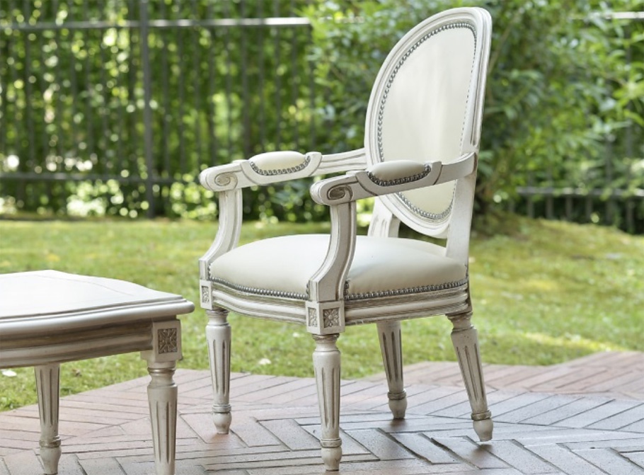 Baby chair from the Italian manufacturer Annibale Colombo. Model on figured legs. The material is solid wood.Upholstery of textile leather or a choice of the catalog of the manufacturer. Offered lacquer finish in white. Armrests augmented soft tabs. Decoration are ornamental carnation and hand carved.