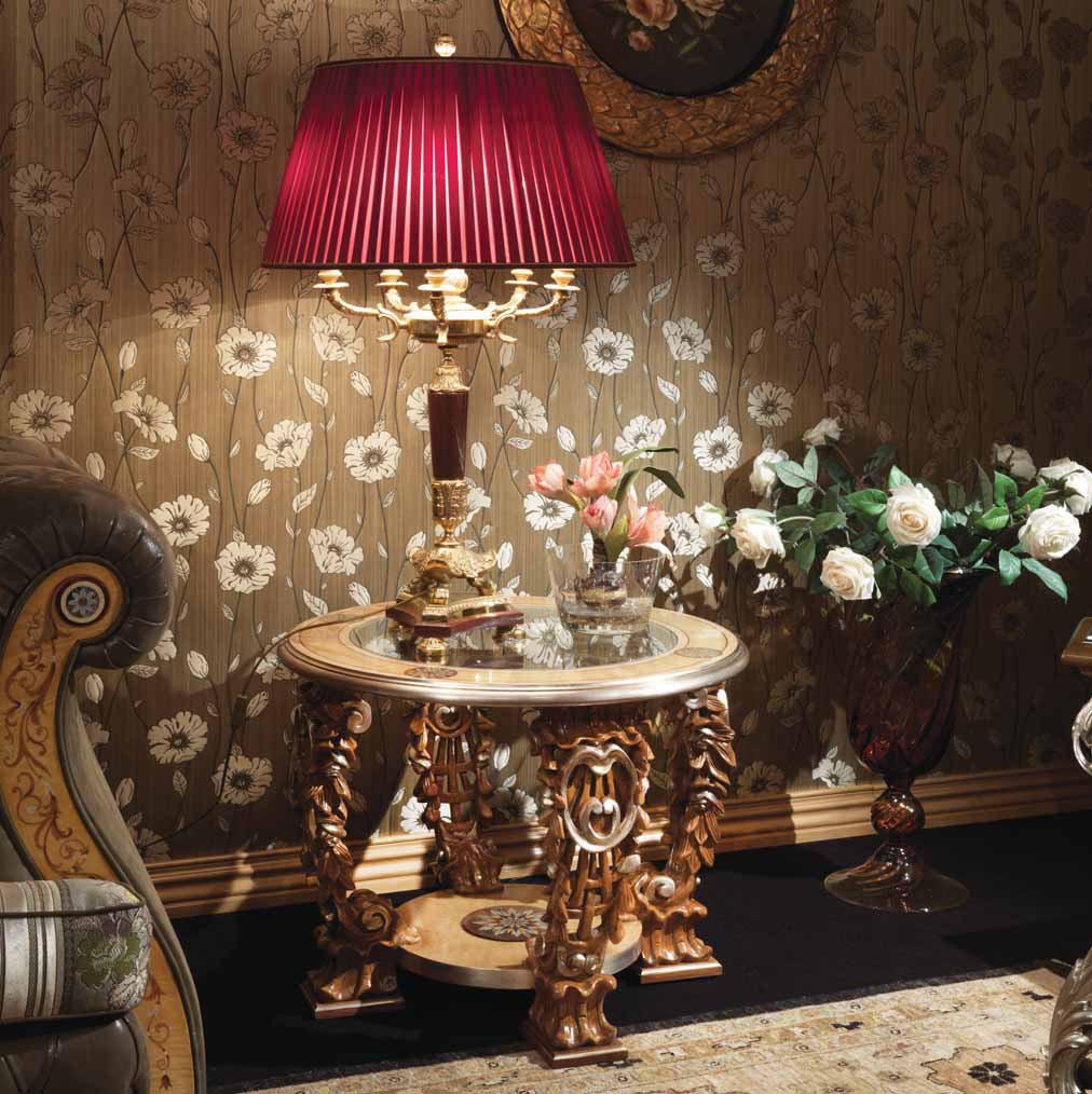 Round table from Italian manufacturer Ezio Bellotti. Frame - wood. The table top is made of glass. The model is decorated decorative carving and inlay. Finish gilding. Colours in stock.