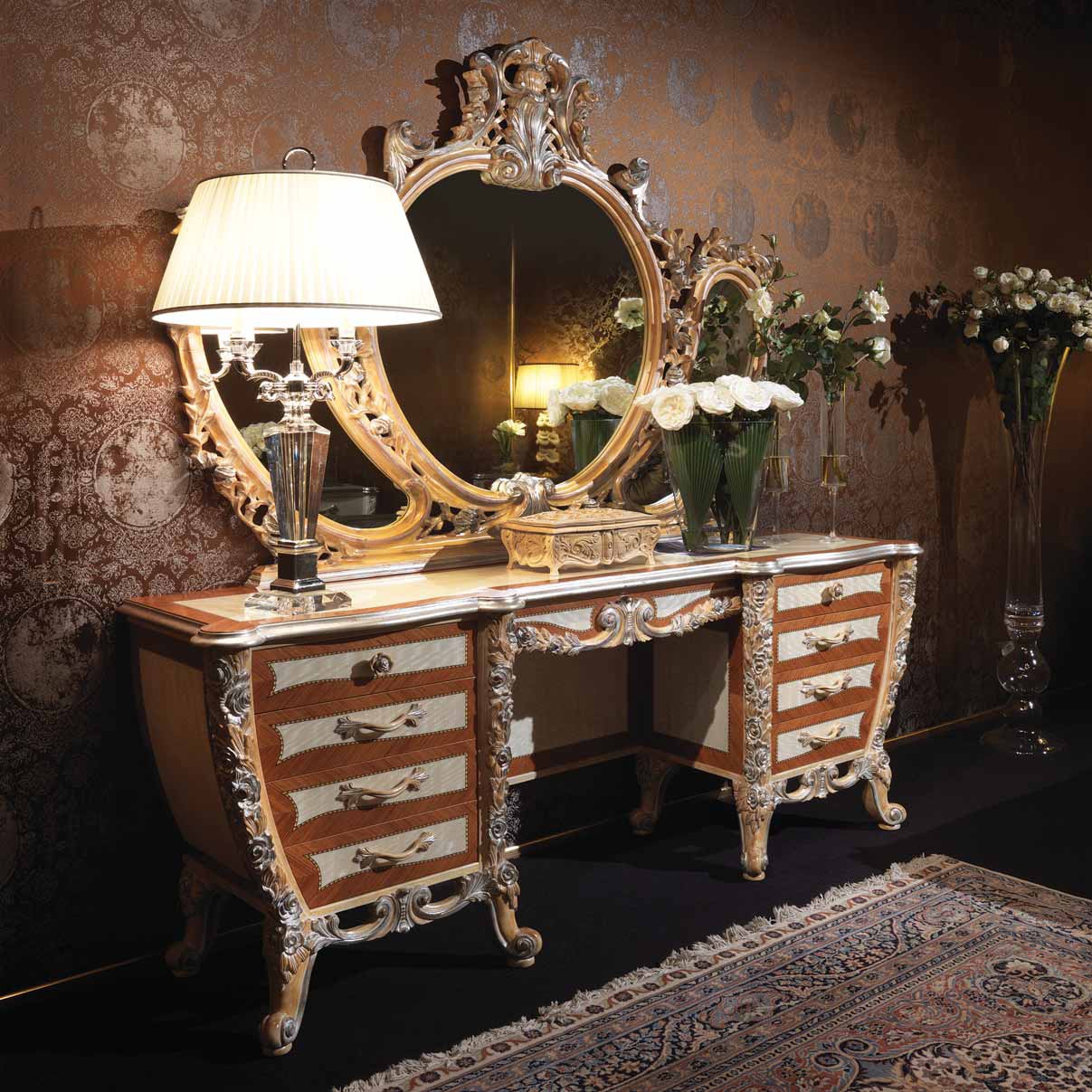 Dressing table from the Italian manufacturer Ezio Bellotti. Material - natural wood, finishing lacquer. The decor is enhanced by carved elements in gold plated and silver plated finish. Model for bedroom in classical style. Colours in stock.