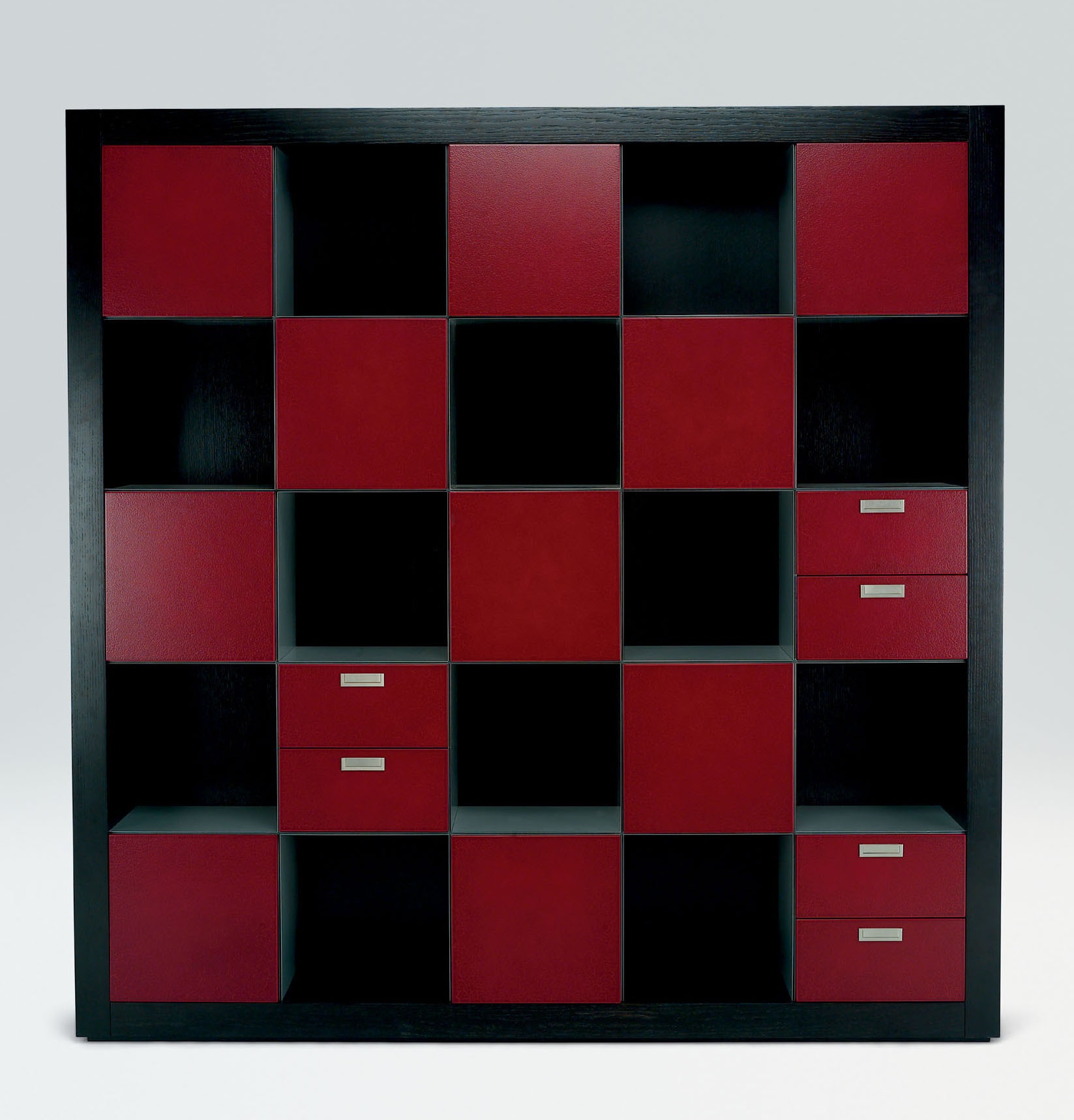 The rack is square shaped Origami Italian manufacturer Armani Casa. Presents a model of the rack square shape. With built-in drawers and shelves. Color combined black and red. A modern solution for the interior library or office.