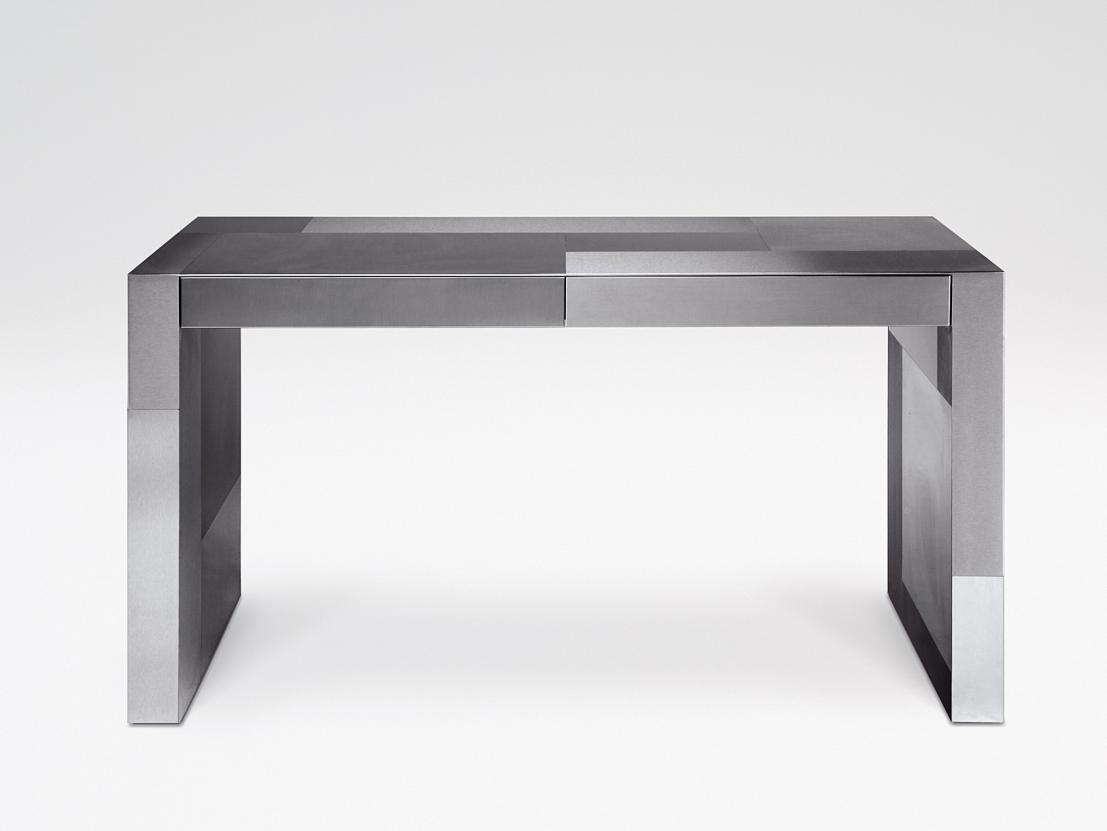 Adelchi writing Desk in silver color Italian manufacturer Armani Casa. Desk with brushed silver metal leaves. Equipped with built-in drawers. A modern solution for the interior of the Cabinet.