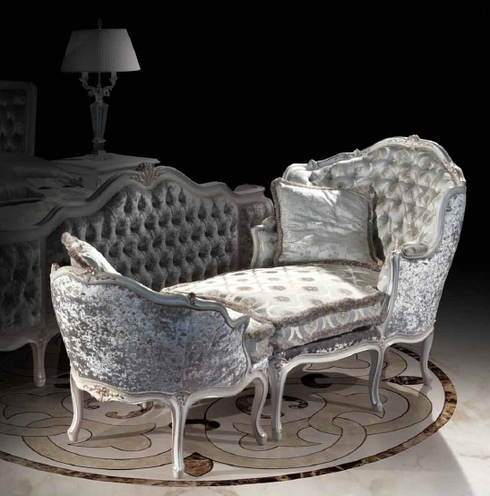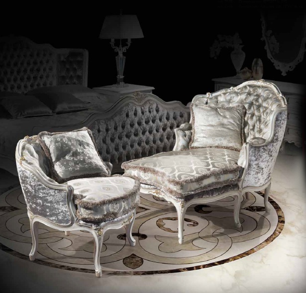 Headsets for bedrooms from Italian manufacturer Ezio Bellotti. Set includes double bed, armchair in fabric, dressing table and bedside tables. The furniture is made of natural wood. Upholstery textile from the company portfolio. Decorative elements in silver-plated finish. The model is made in classic style. Colours in stock.