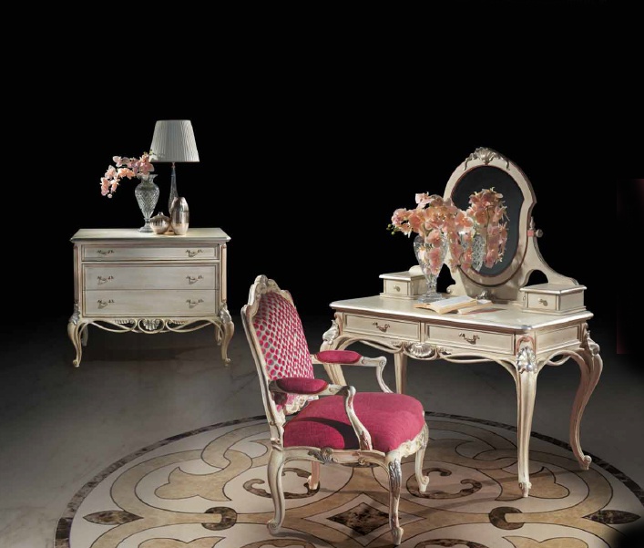 Dressing table from the Italian manufacturer Ezio Bellotti. The model is made from natural wood. Carved elements in gold plated and silver plated finish. Mirror in classic style. Colours in stock.