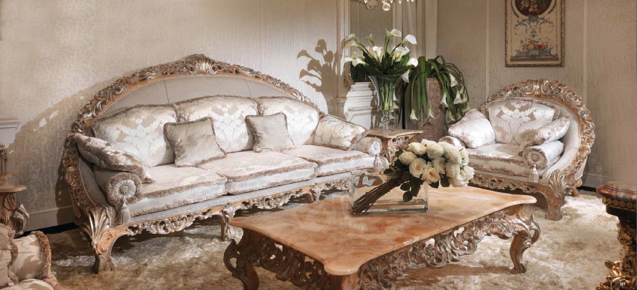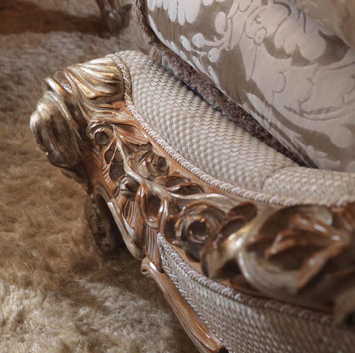 Sofa set from the Italian manufacturer Ezio Bellotti. Includes sofa, chair and coffee table. The frame is made from a natural tree. The furniture is decorated with carving, handmade in gold plated finish. Upholstery textile from the assortment of colors in stock.
