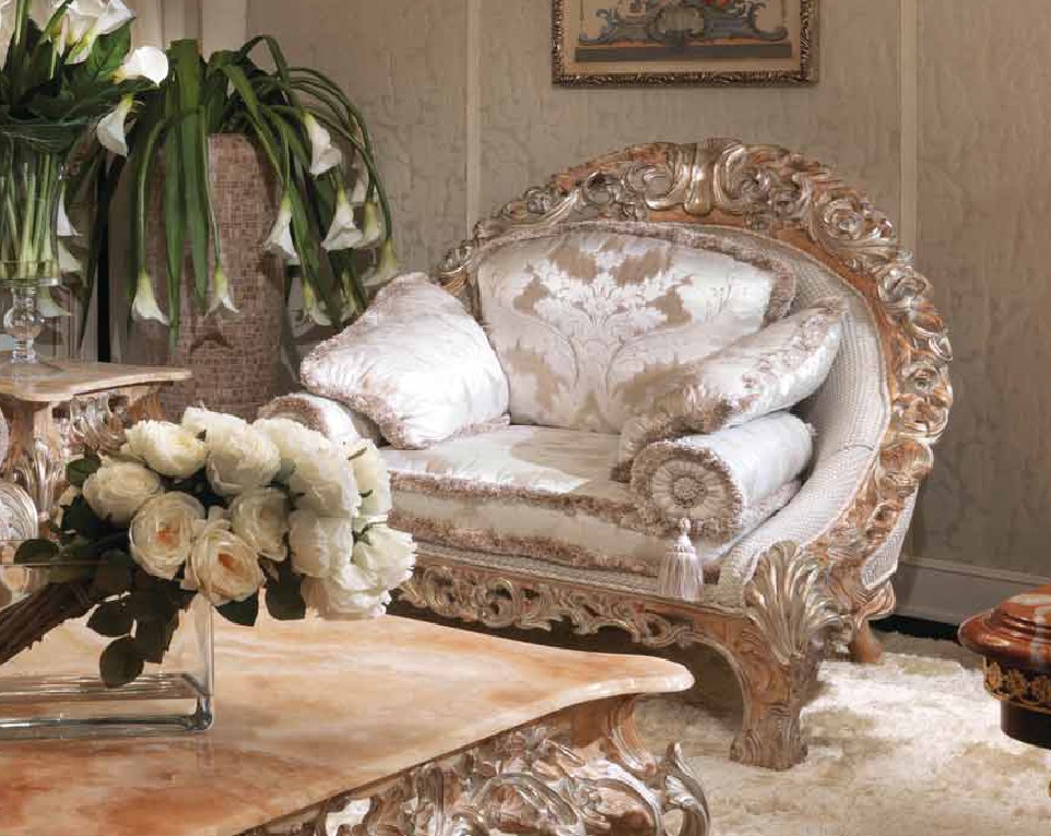 Living room chair from the Italian manufacturer Ezio Bellotti. The frame is made from a natural tree, decorated with hand-carved in gold-plated finish.