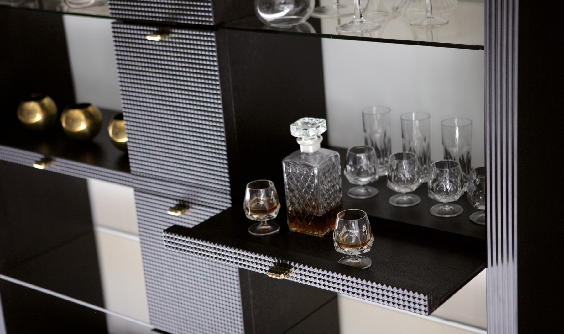 Bookcase Dimitri from Italian manufacturer Angelo Cappellini. Multifunctional model with pull-out shelves and drawers. The body is made of solid wood, surface is corrugated. Color catalog of the company. The design is executed in art Deco style.
