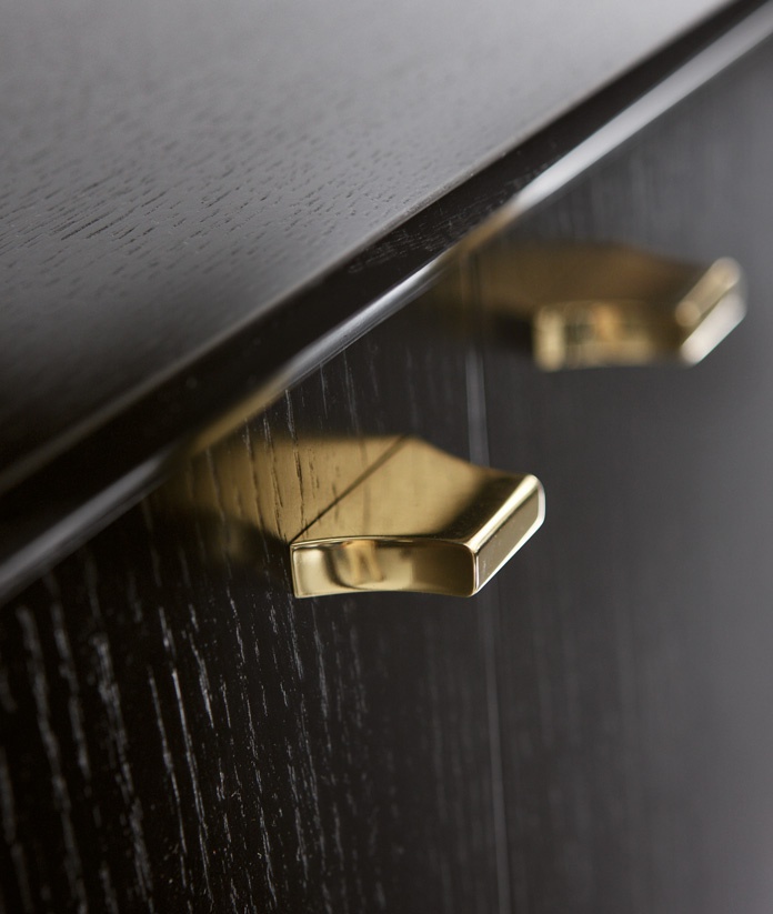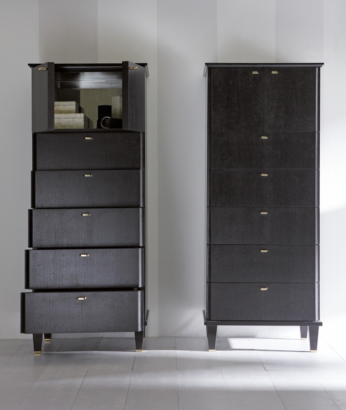 High chest of drawers on legs Desire from the Italian manufacturer Angelo Cappellini. The body is made from solid wood, the surface is treated with lacquer. Fittings - metal. Color is black. A model with five drawers and two swing doors. The design is executed in art Deco style.