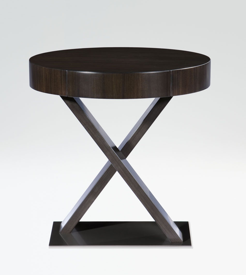 Bedside table Cimarosa round shape Italian manufacturer Armani Casa. Table with a built in countertop with drawer, height 7 cm Legs set on a metal platform. A modern solution for the interior bedroom. Finish to be selected from the manufacturer's catalogue.