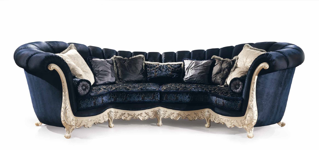 Three seater sofa from Italian manufacturer Ezio Bellotti. Upholstery textile from the company portfolio. The frame is made of wood. The design complements the rich d?cor carved elements are handmade, decorated with silver. Upholstery textile from the company portfolio.