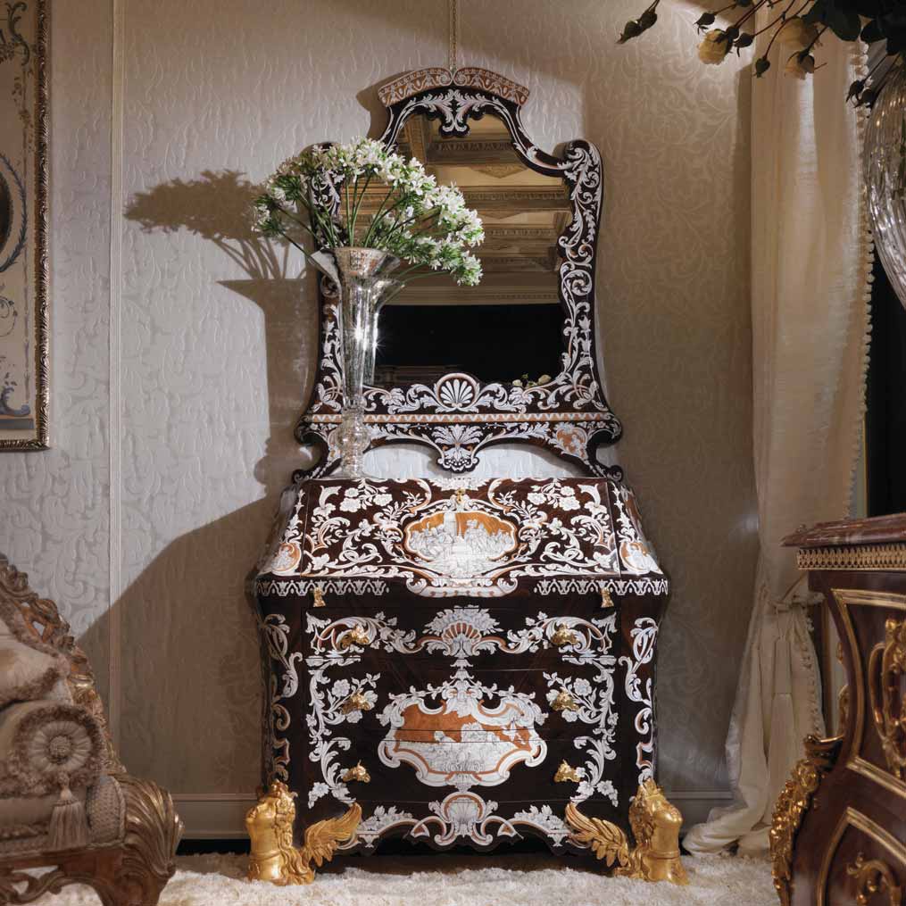 | Description: | A chest of drawers from Italian manufacturer Ezio Bellotti. The model is a reproduction of the famous Italian chest of drawers Piffetti cabinetry. The product is made in Baroque style made of natural wood, the surface is covered with varnish. Chest decorated with inlay and painted genre and historical scenes. Gold-plated legs, hardware on the drawers and jewellery complement the design. This rare beauty of a chest of drawers can decorate the interior of any bedroom or boudoir. Color scheme: Golden, dark brown, white; trim parts on the photo. |