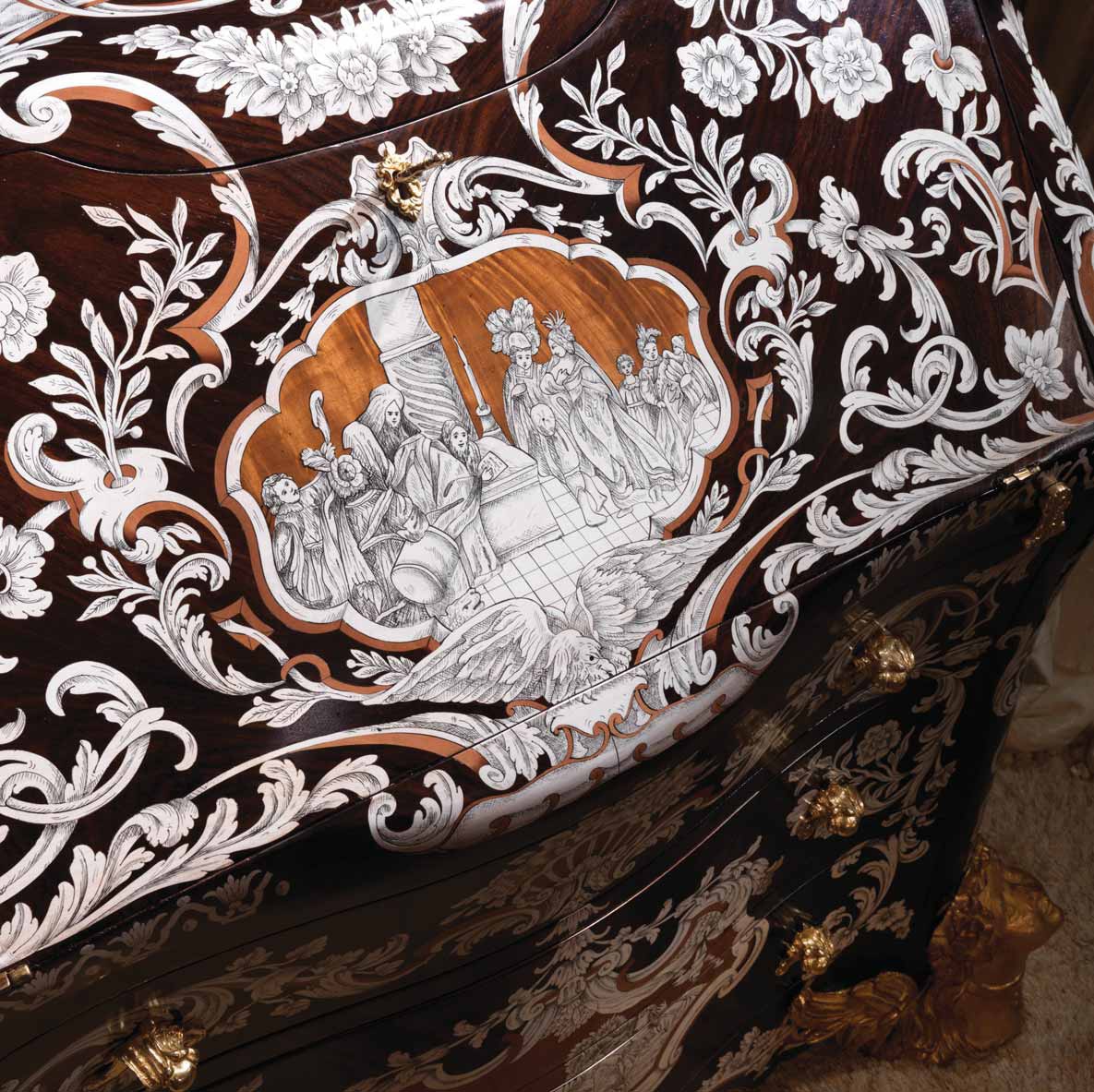 A chest of drawers from Italian manufacturer Ezio Bellotti. The model is a reproduction of the famous Italian chest of drawers Piffetti cabinetry. The product is made in Baroque style made of natural wood, the surface is covered with varnish. Chest decorated with inlay and painted genre and historical scenes. Gold-plated legs, hardware on the drawers and jewellery complement the design. Color scheme: Golden, dark brown, white.