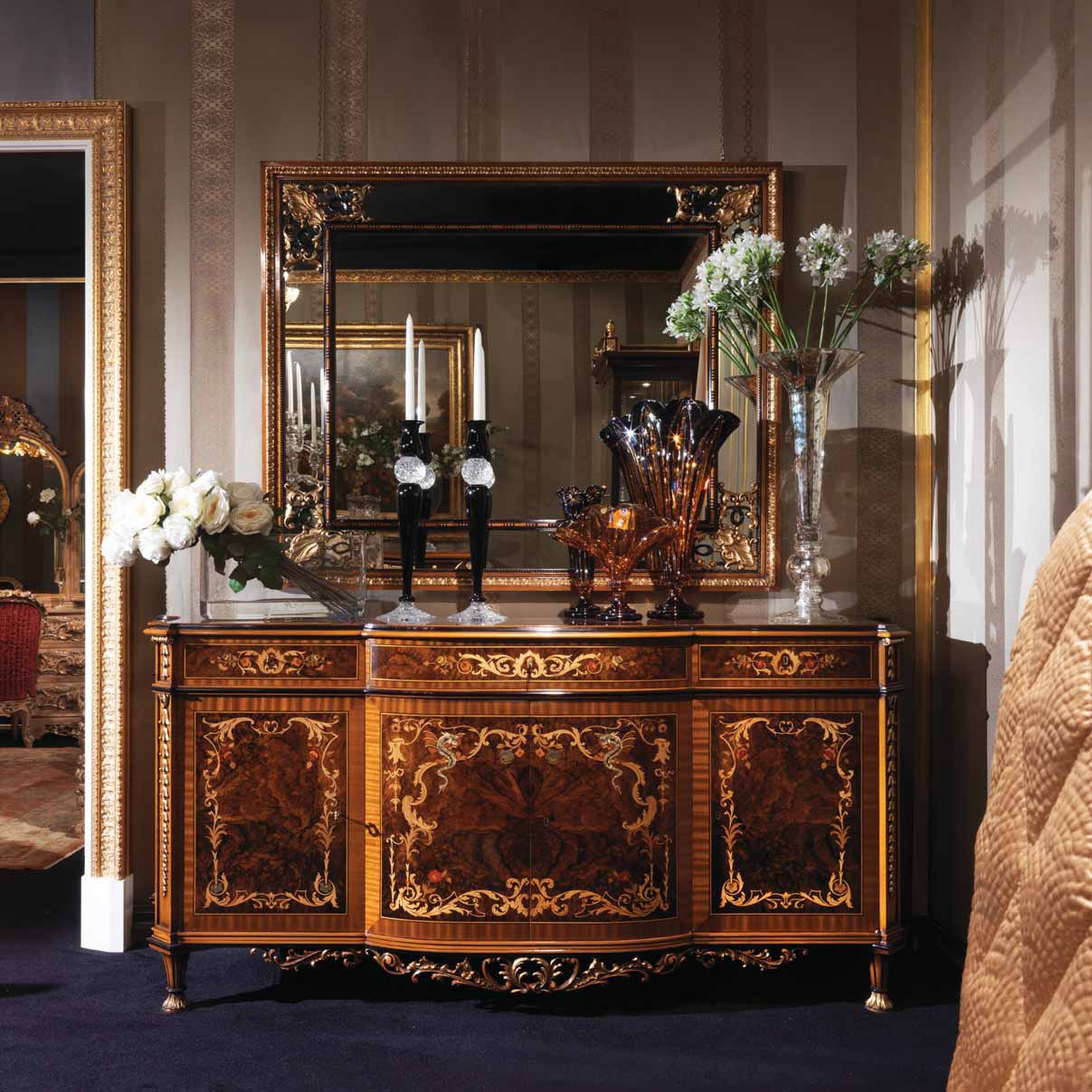 | Description: | A chest of drawers from Italian manufacturer Ezio Bellotti. The frame is made from natural wood, finished with varnish. The model is decorated with rich decor and intarsia. A beautiful example of a classic dresser for bedroom or living room. |