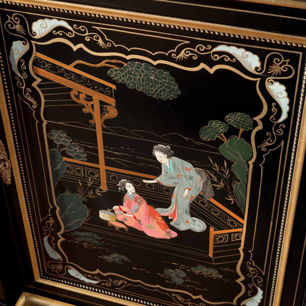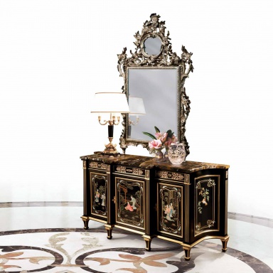 The buffet from the Italian manufacturer Ezio Bellotti. The product is made of natural wood, the surface is covered with varnish. Marble countertop. The model is decorated with inlay. Colours in stock.