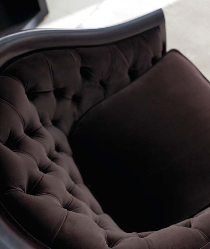 Marta Classic chair from the Italian manufacturer Angelo Cappellini. Model with a rounded back which fades into the armrests. The back is decorated with a decorative stitch. Legs and frame made of solid wood. The surface is covered with a glossy varnish. The upholstery is made of textile. Seat cushion is removable. The filler is not deformable polyurethane foam.