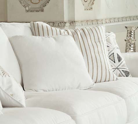 Three-seater sofa on wooden frame with removable cushions square Long island Italian producer Ville Venete. Padding of thick white textile. Beautiful color combination in white and brown tones. A style classic.