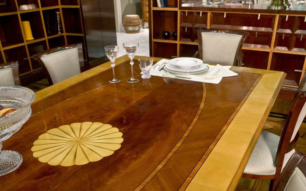 The table from the Italian manufacturer Annibale Colombo. Model on figured legs. Countertop rectangular. Material - cherry wood. The finish offers a glossy varnish.