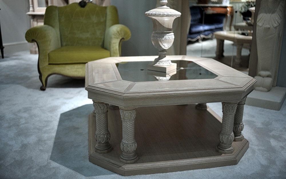 Coffee table by Italian manufacturer Annibale Colombo. The model is made in classic style. The frame is made of oak. The top is covered with marble and decorated with mirror insert. The finish offers a glossy varnish.