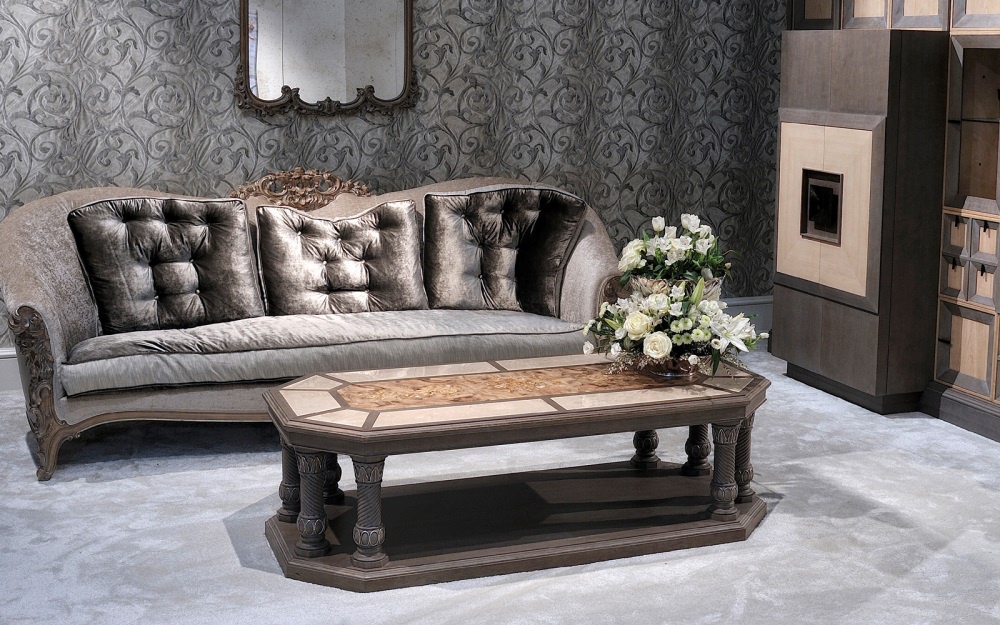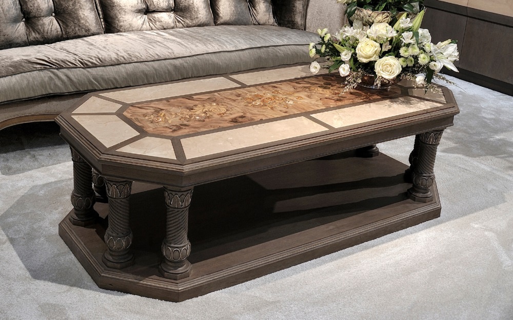 Coffee table by Italian manufacturer Annibale Colombo. The model is made in classic style. Frame - oak. Octagonal table top is covered with marble and inlaid top. The surface is covered with a glossy varnish. Decoration is the decorative carving handmade.